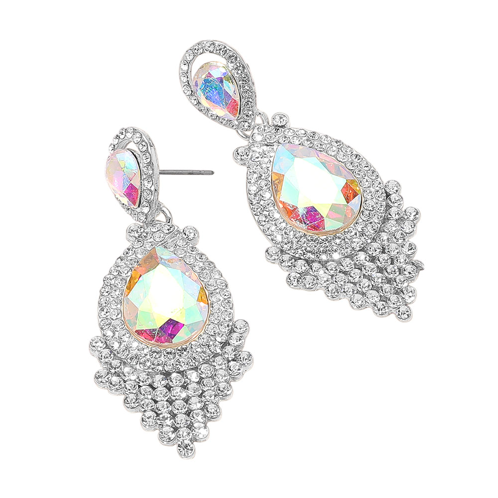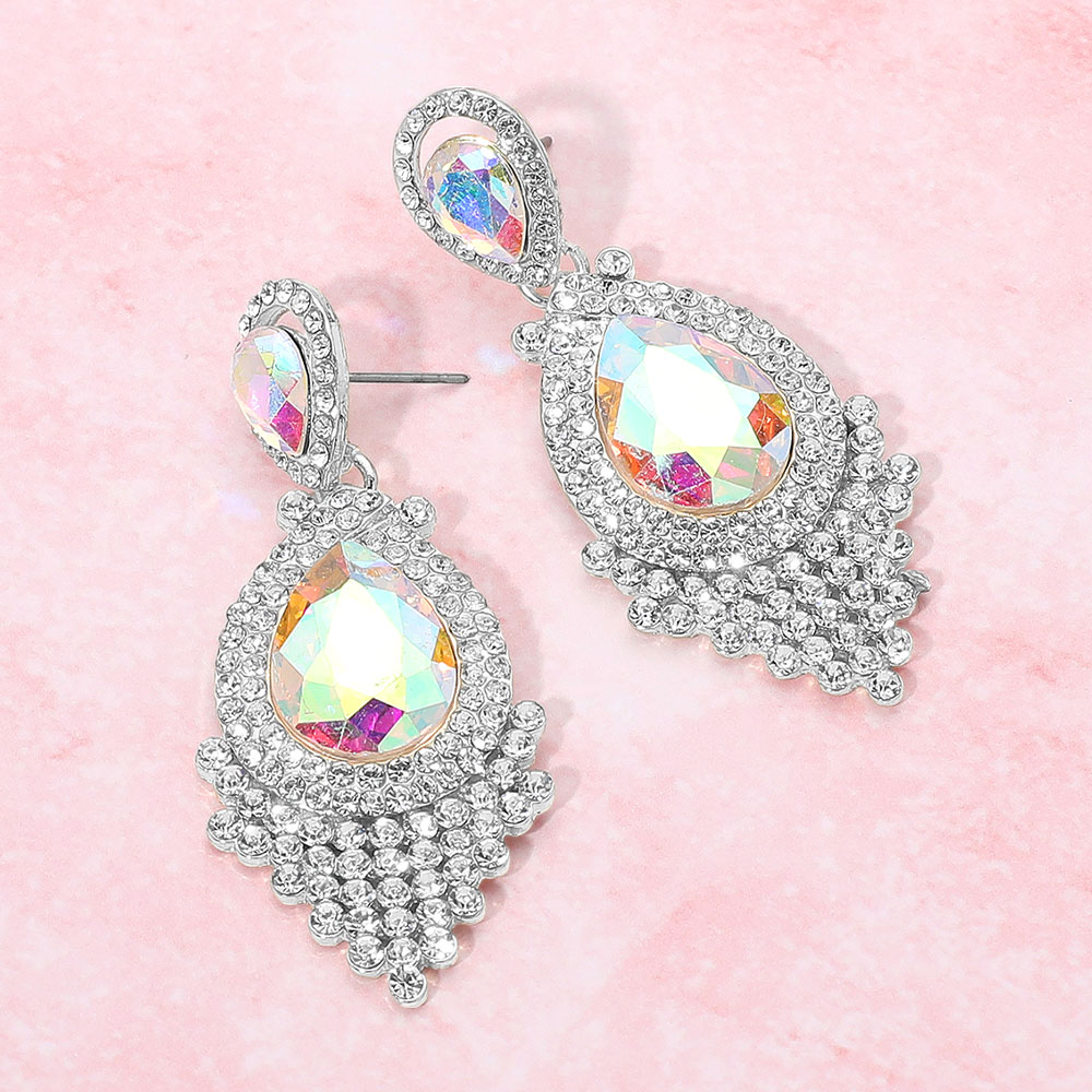 • Elegant teardrop dangle earrings with sparkling crystal embellishments and layered fringe design, ideal for weddings, parties, or glamorous evening events.