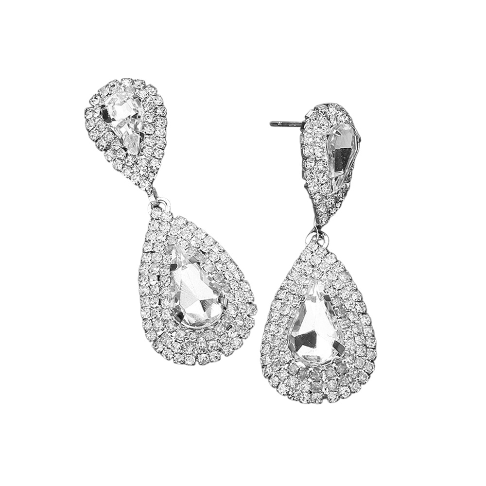 Teardrop Stone Centered Rhinestone Paved Rim Dangle Evening Earrings