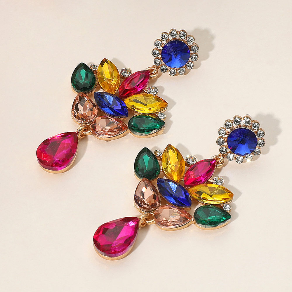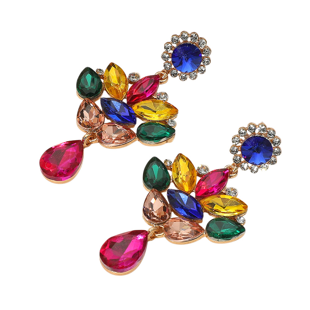 Details • Size : 1.25" X 2.3" • Post Back • Glamorous statement earrings featuring a floral arrangement of faceted crystals with a teardrop accent. Designed for maximum sparkle and elegance, these earrings elevate any outfit, making them perfect for weddings, evening events, and special occasions. • Lead and Nickel Compliant