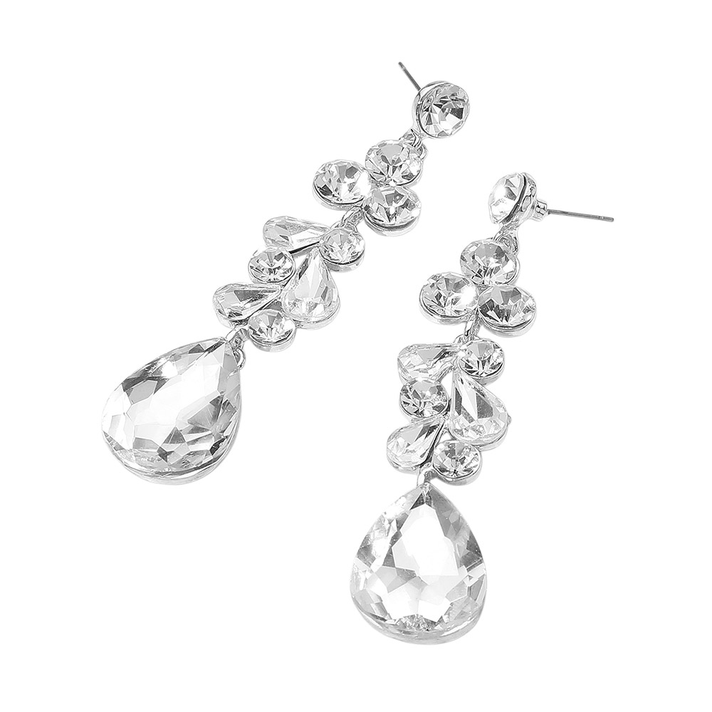 • Elegant dangle earrings featuring a mix of teardrop and round stones in a cascading design. These statement earrings offer shimmering accents and graceful movement, ideal for enhancing formal or evening looks.