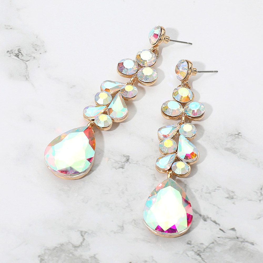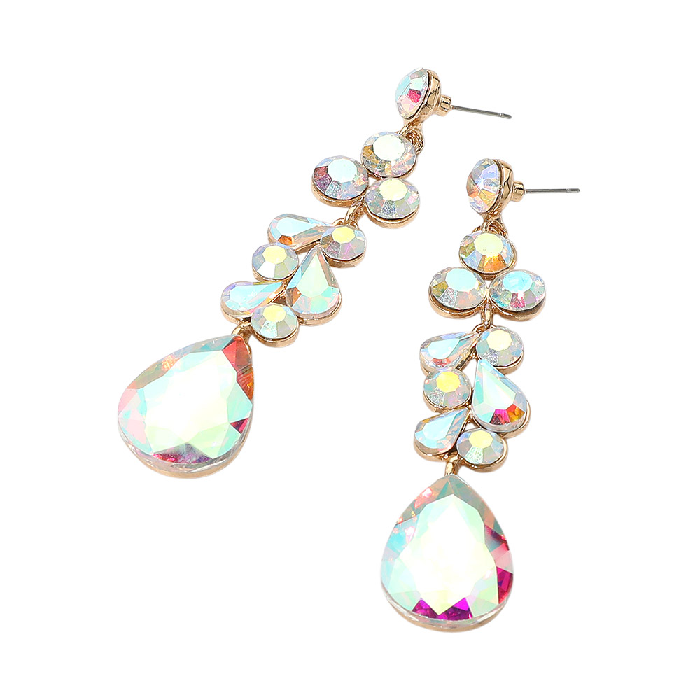 Details • Size : 0.7" X 3.4" • Post Back • Elegant dangle earrings featuring a mix of teardrop and round stones in a cascading design. These statement earrings offer shimmering accents and graceful movement, ideal for enhancing formal or evening looks. • Lead and Nickel Compliant
