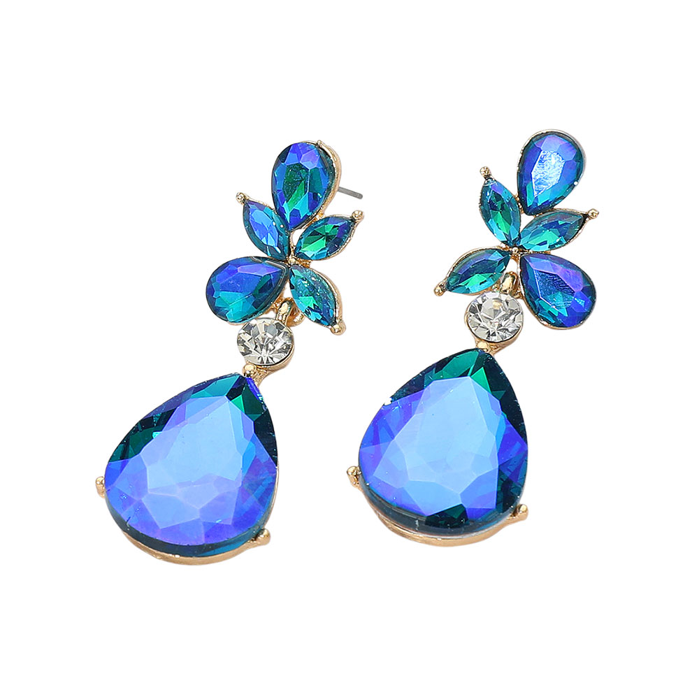 • Make a striking impression with these faceted teardrop statement earrings. Featuring bold, multi-cut stones arranged in a floral-inspired design, they capture light beautifully for a refined yet dramatic finish—perfect for evening wear or elevating any special occasion look.