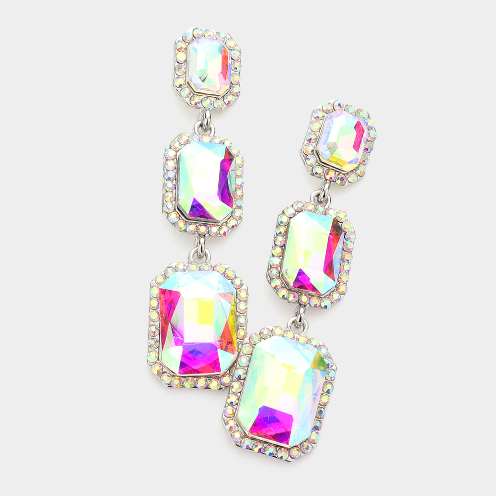 Triple Emerald Cut Stone Link Dangle Evening Earrings