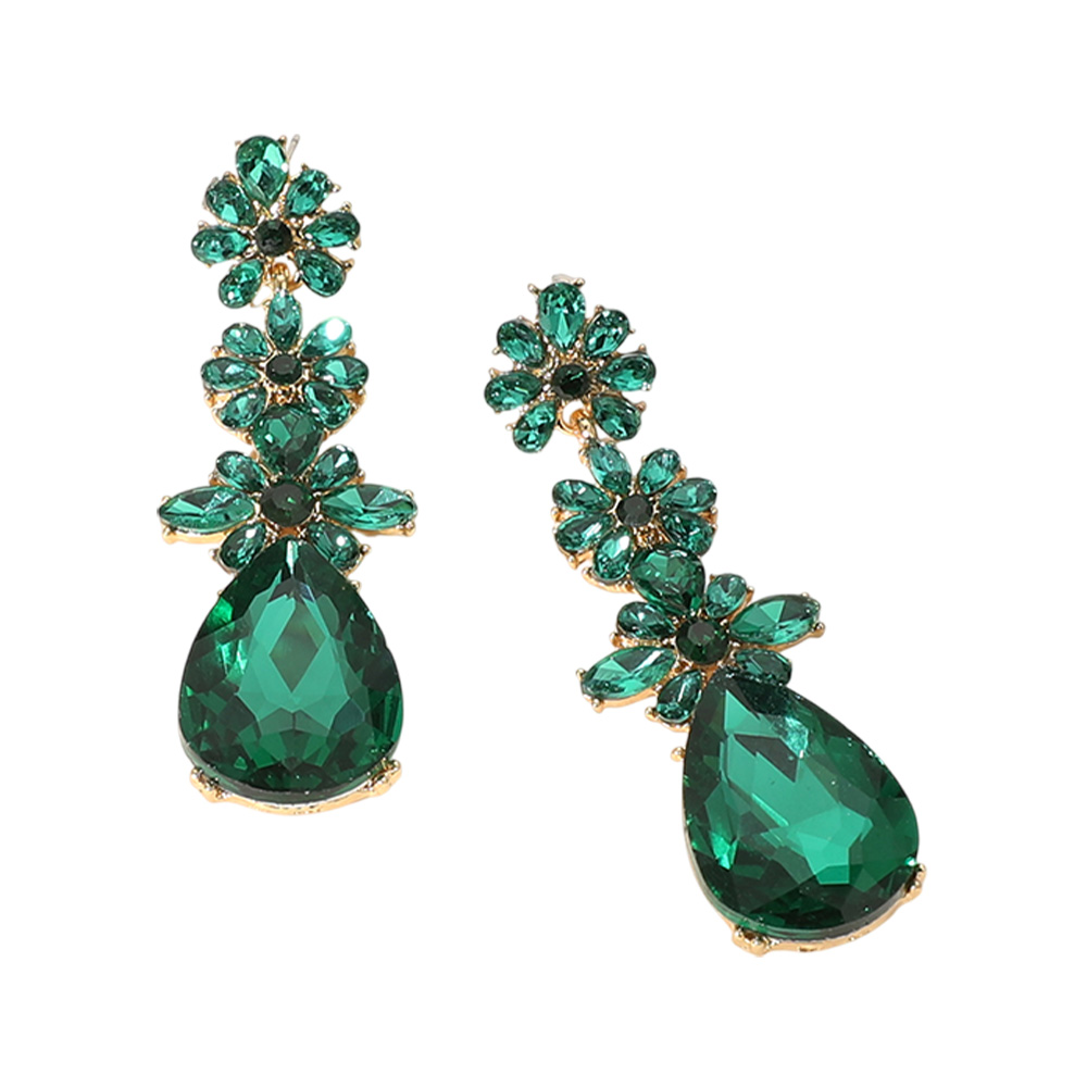 Triple Flower Stone Cluster Link Teardrop Pointed Evening Earrings