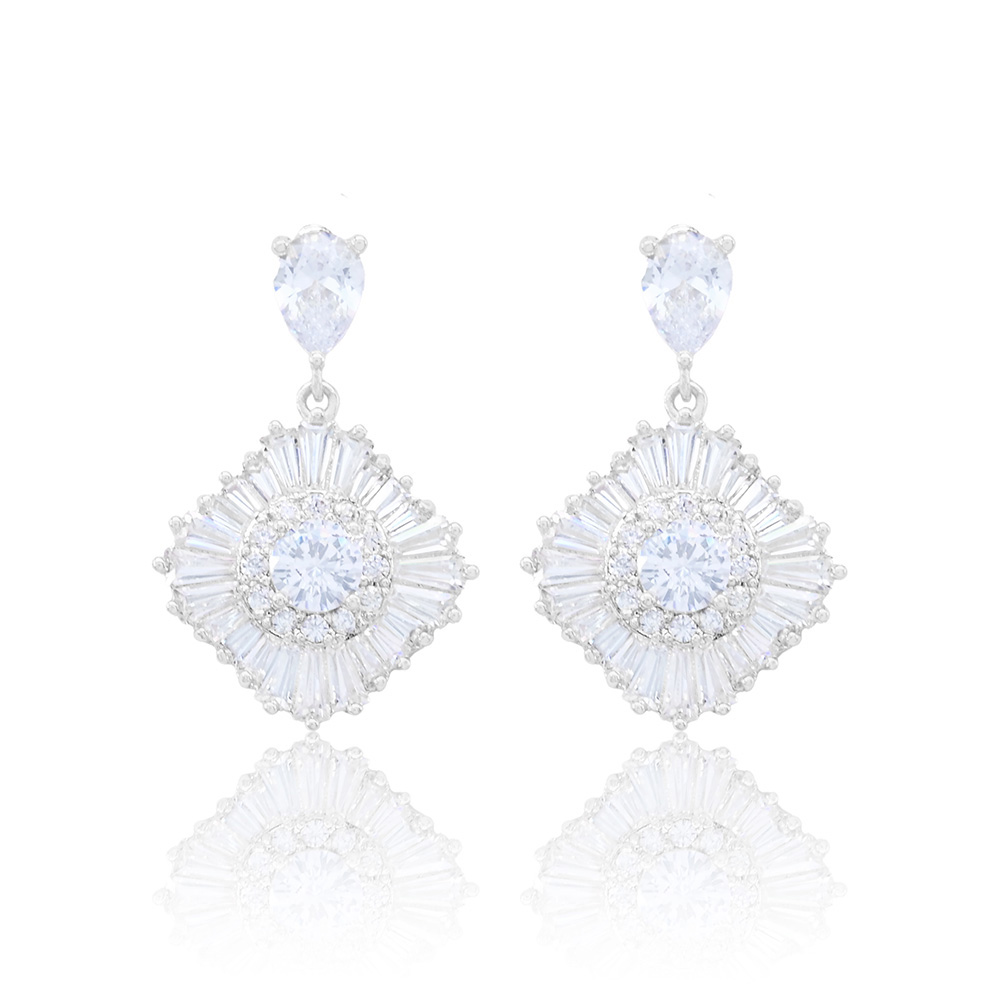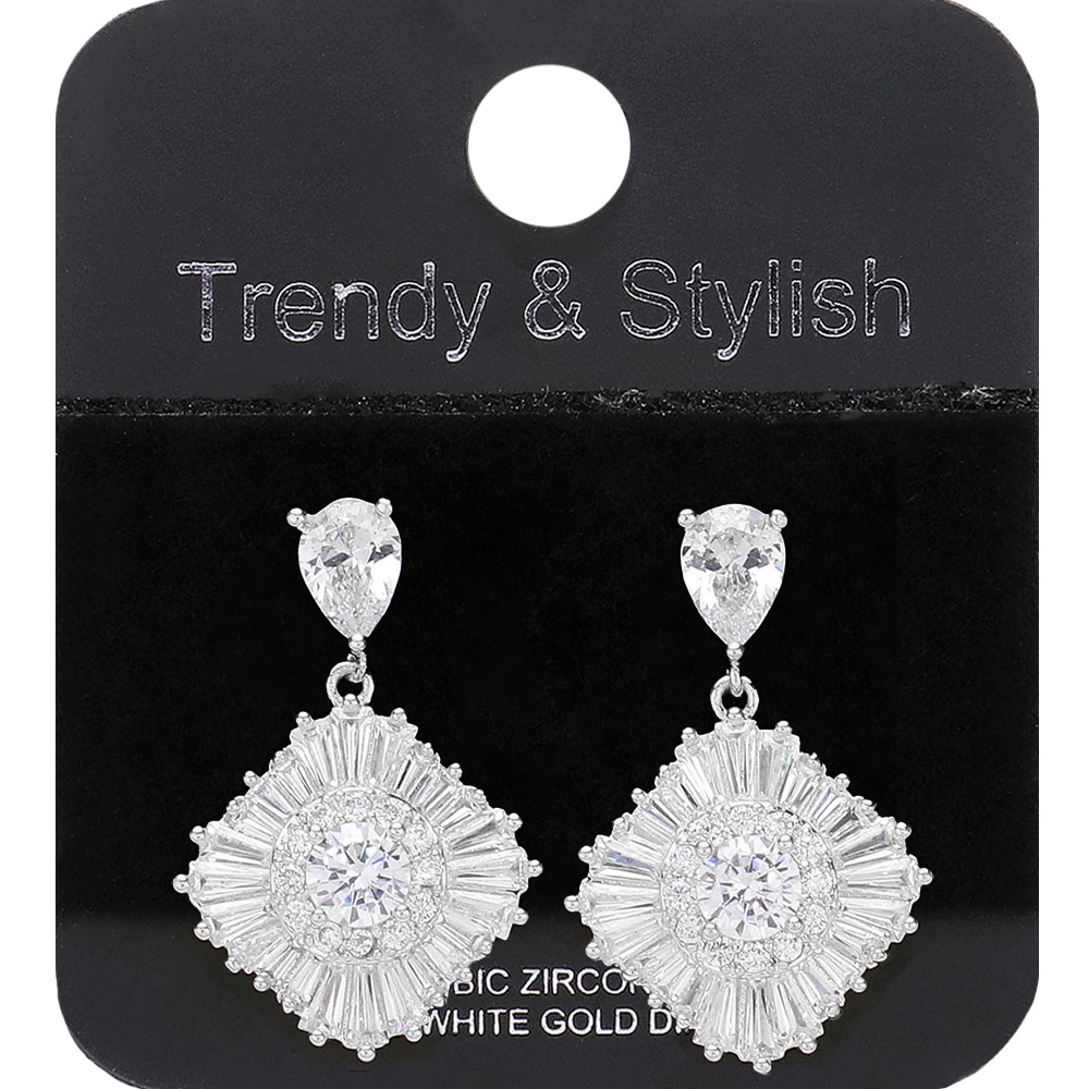 White Gold Dipped CZ Stone Embellished Dangle Evening Earrings