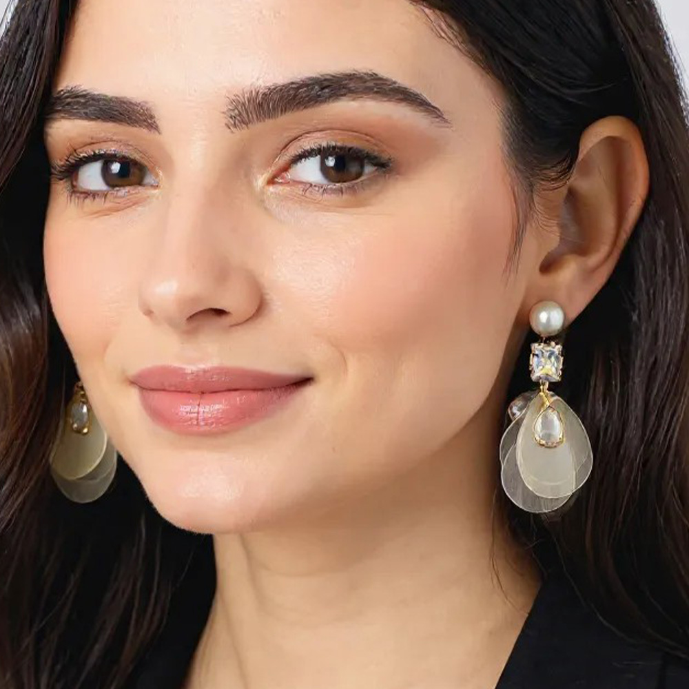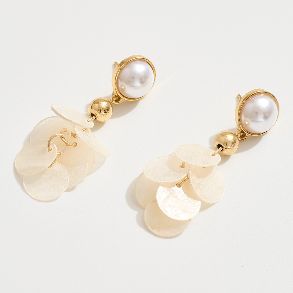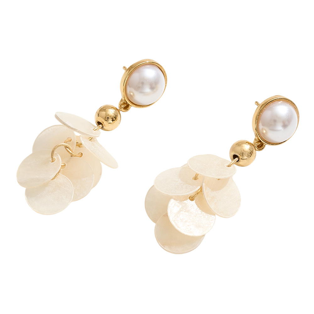 Details • Size : 1" X 2" • Post Back • Graceful and unique, these pearl stud earrings feature cascading shell disc dangles that shimmer with every movement. A refined blend of classic and playful design, they’re perfect for beachside occasions, summer outfits, or adding a touch of elegance to day-to-night looks. • Brass • CZ Cubic Zirconia • Gold Dipped • Hypoallergenic • Lead and Nickel Compliant • Made In Korea