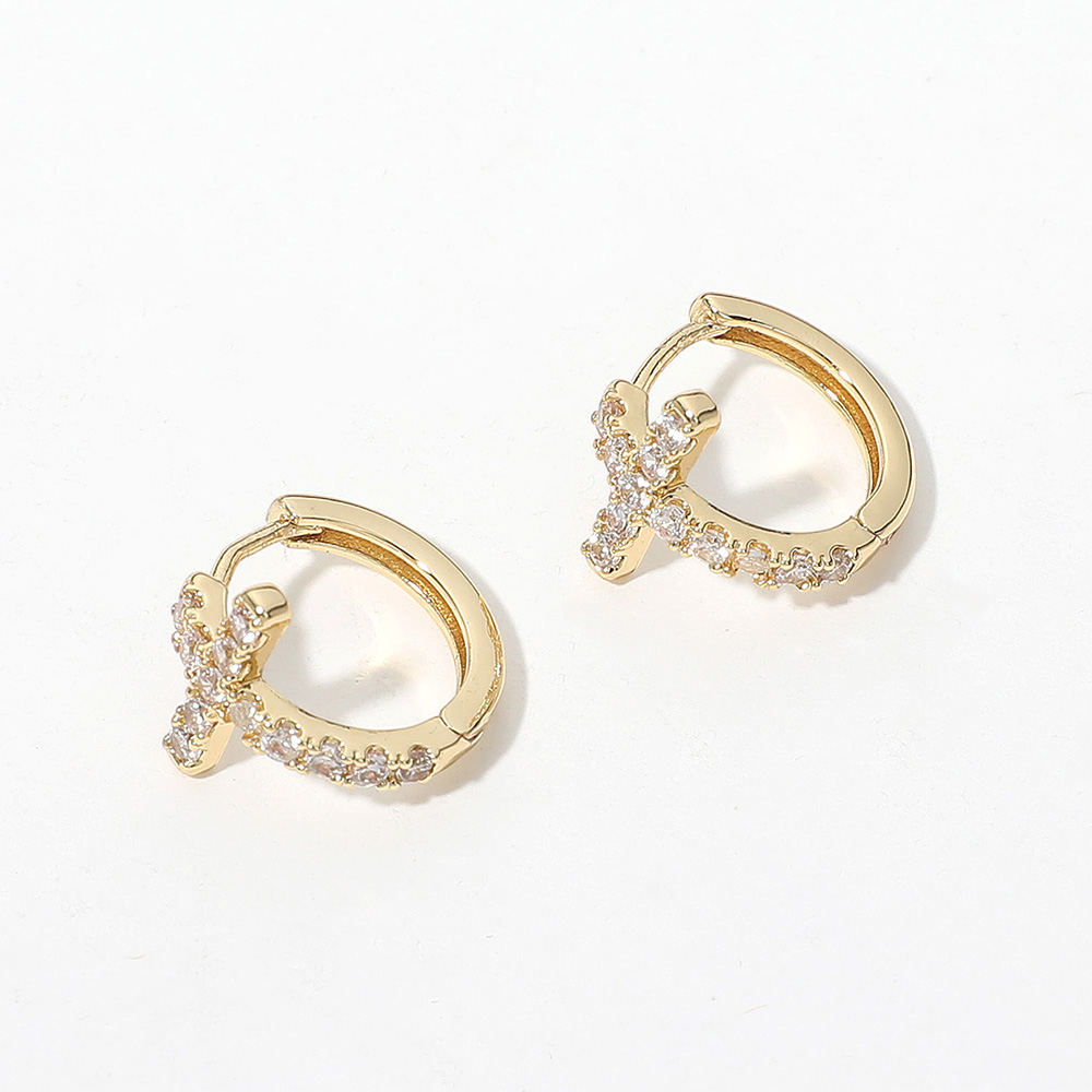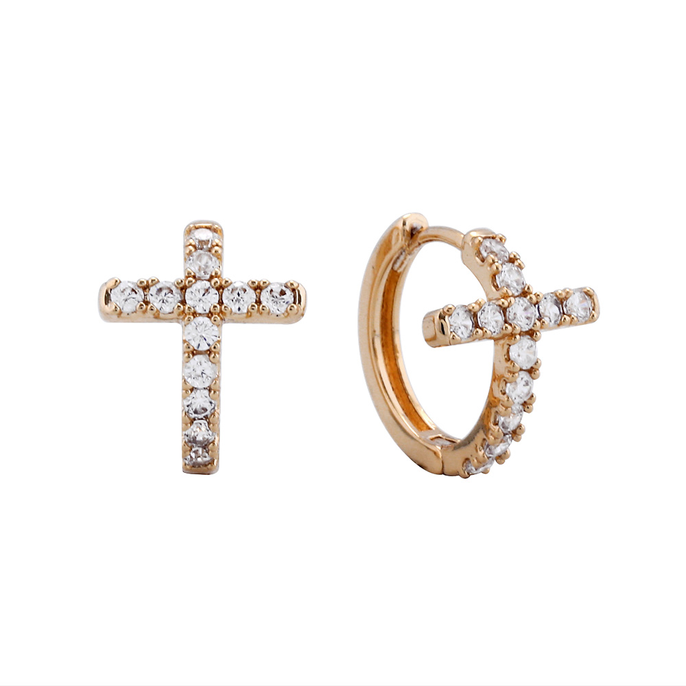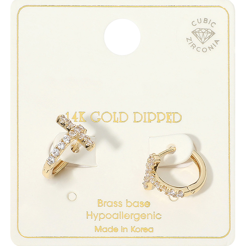 White Gold Dipped CZ Stone Paved Cross Huggie Hoop Earrings