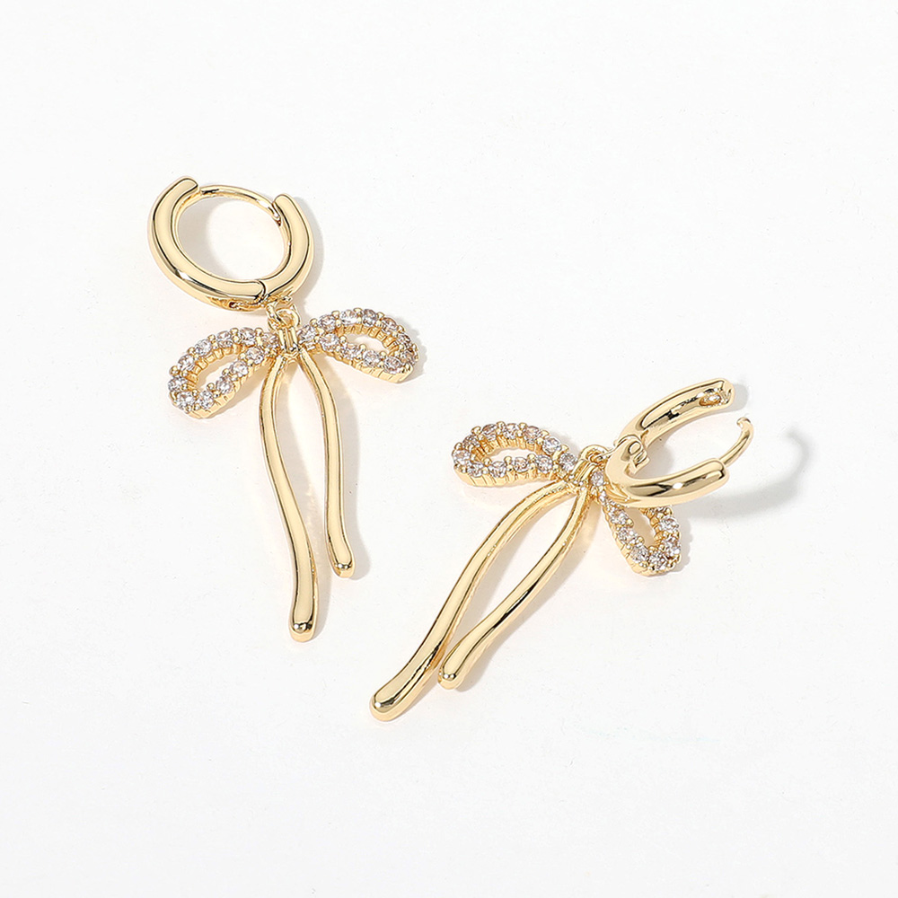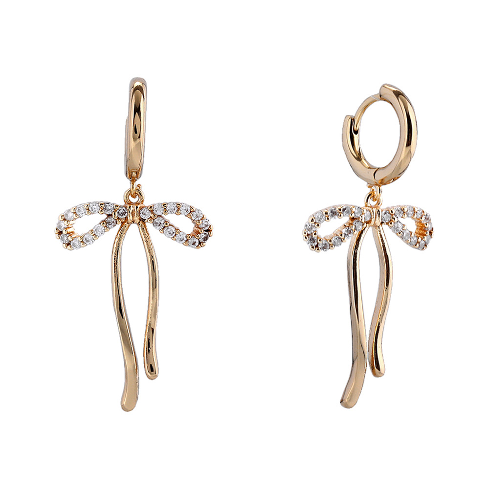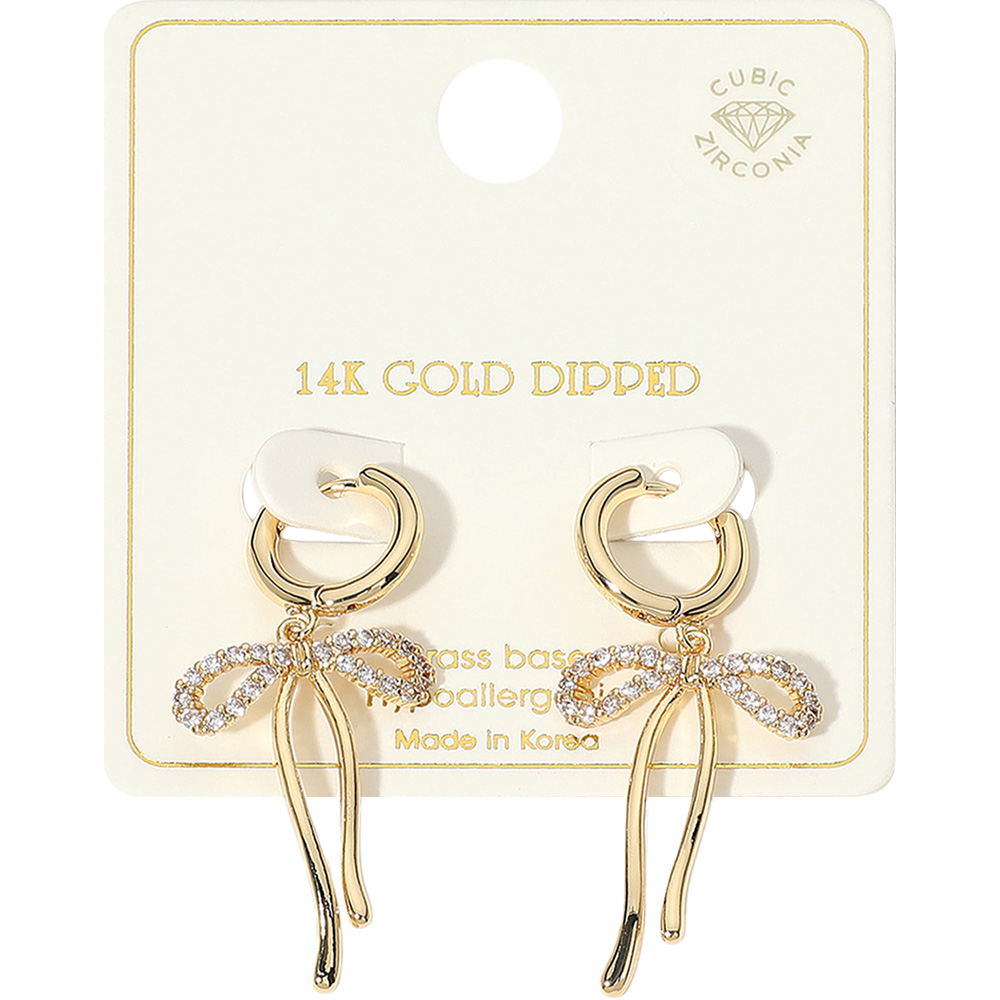 14K Gold Dipped CZ Stone Paved Dangling Ribbon Huggie Earrings