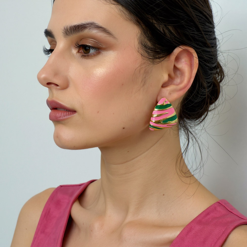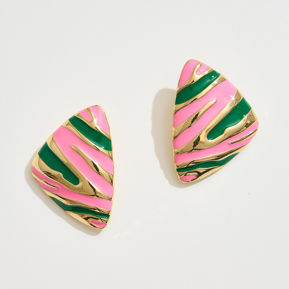 Details • Size : 1.25" X 1.5" • Post Back • Turn heads with these abstract striped enamel earrings, designed with vivid contrast and bold patterns for a playful yet chic vibe. Lightweight and eye-catching, they elevate casual looks and add a daring twist to evening outfits, perfect for statement jewelry lovers. • Brass • Gold Dipped • Hypoallergenic • Lead and Nickel Compliant • Made In Korea