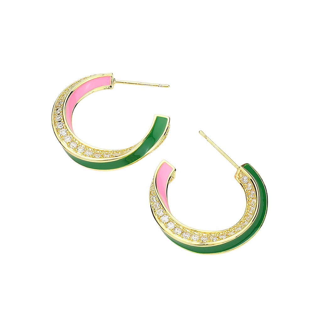 14K Gold Dipped Enamel Curved CZ Stone Paved Hoop Earrings