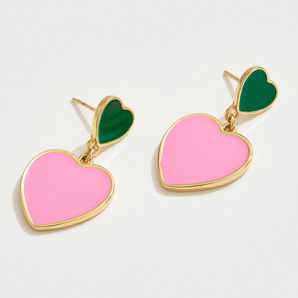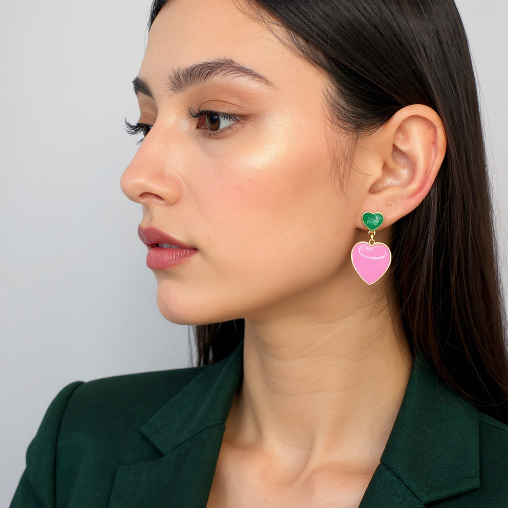 Details • Size : 0.7" X 1.25" • Post Back • Add a pop of playful charm with these bold heart enamel drop earrings, featuring a vibrant two-tone design for a fun and stylish statement. Lightweight and versatile, they bring a touch of romance and personality to casual looks or evening ensembles. • Brass • Gold Dipped • Hypoallergenic • Lead and Nickel Compliant • Made In Korea