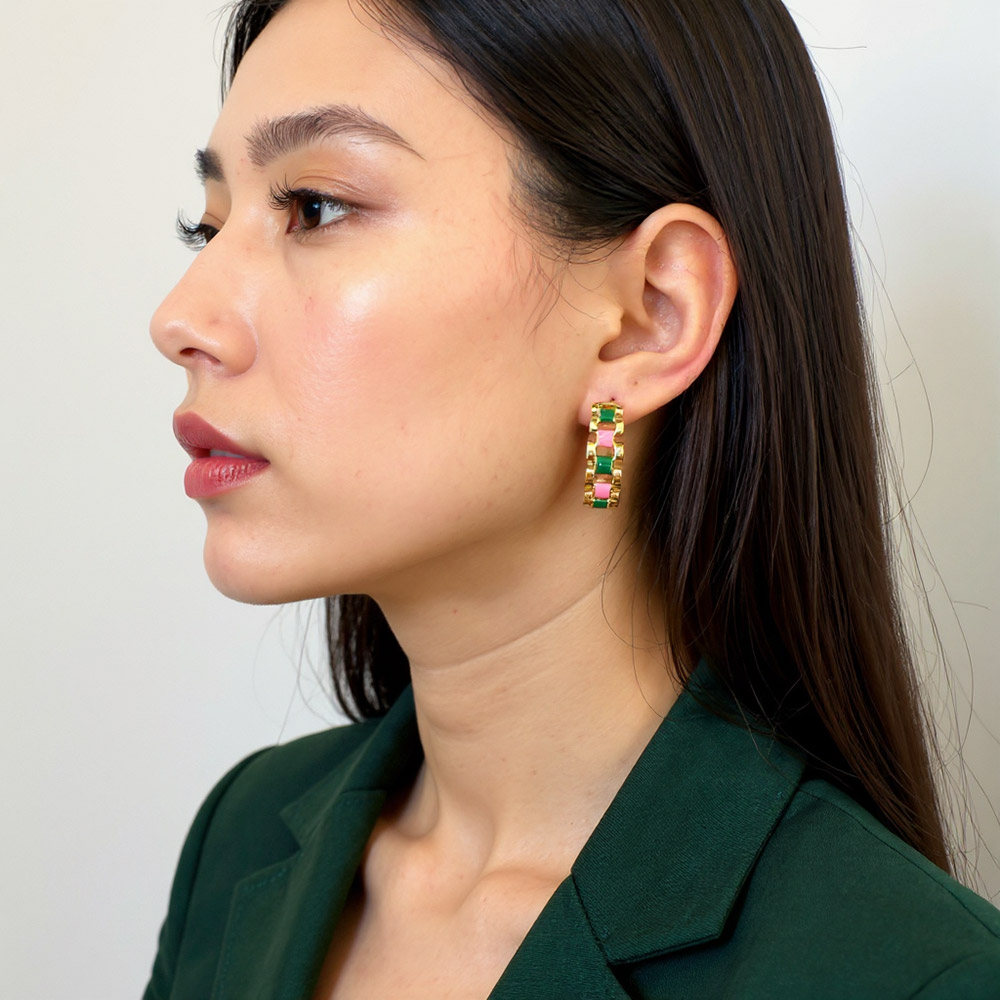 Details • Size : 1" X 1" X 0.3" • Post Back • Turn heads with these chunky enamel link hoop earrings, blending vibrant accents with a bold chain-inspired design. Perfect for elevating casual outfits or adding flair to evening looks, they’re lightweight, trendy, and a must-have for playful statement styling. • Brass • Gold Dipped • Hypoallergenic • Lead and Nickel Compliant • Made In Korea
