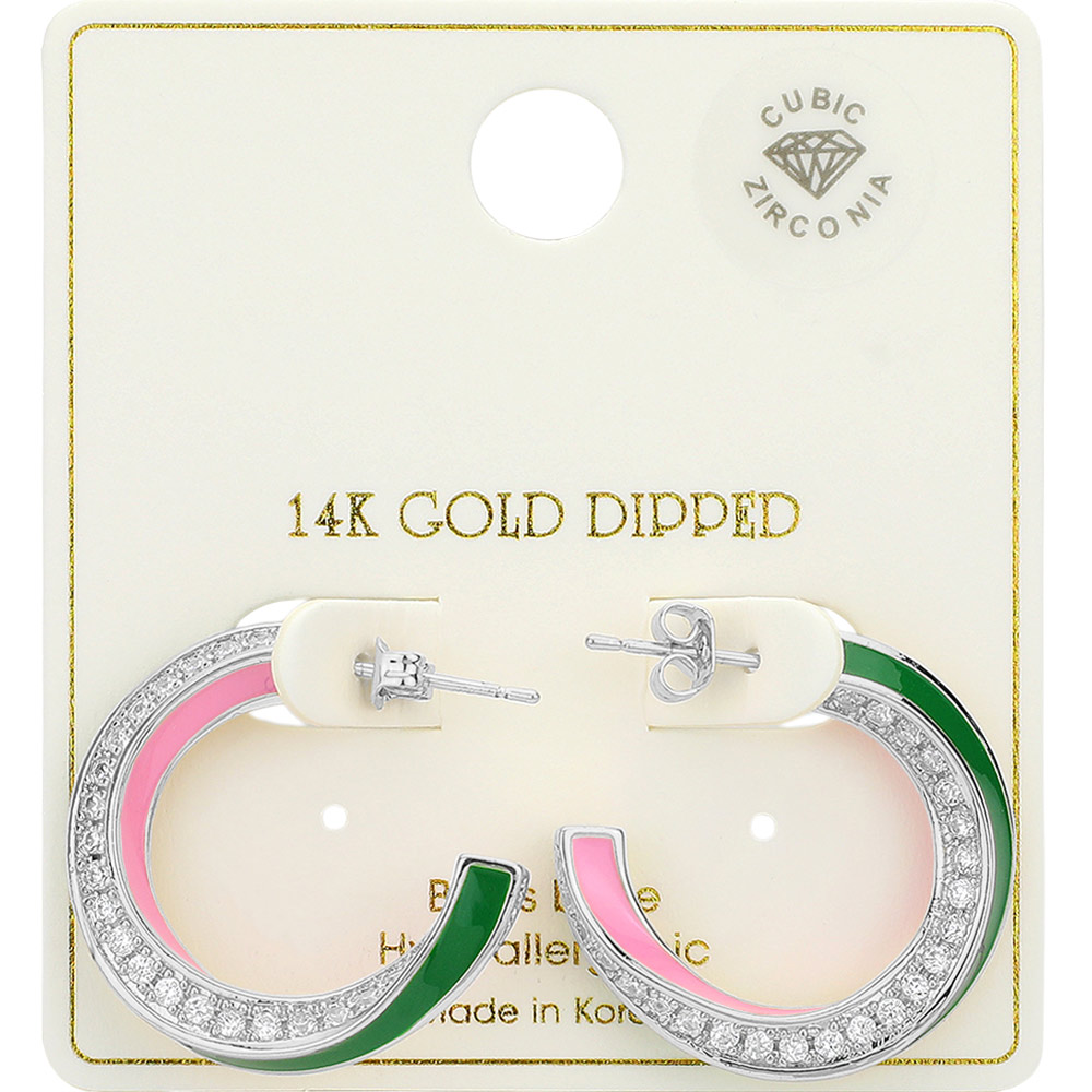 14K Gold Dipped Enamel Curved CZ Stone Paved Hoop Earrings