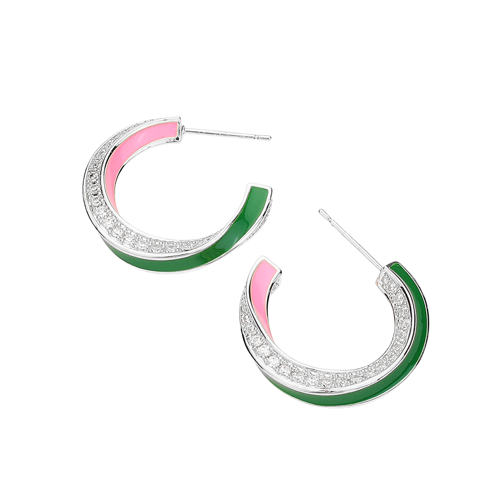 14K White Gold Dipped Enamel Curved CZ Stone Paved Hoop Earrings