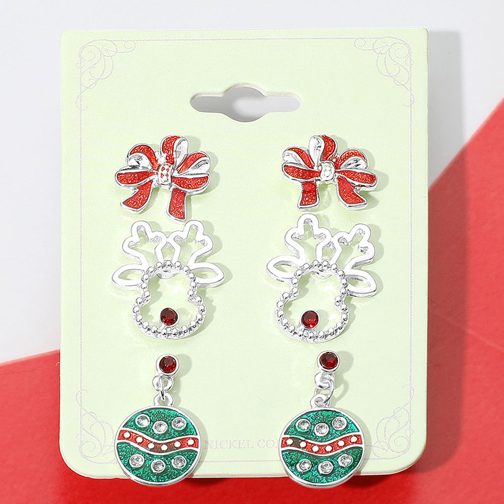 Details • Size : 0.5" - 0.8" L • Post Back • Celebrate the season with this charming 3-pair earring set featuring glittery bows, reindeer silhouettes, and festive ornaments. Perfect for mixing and matching all holiday long or gifting to someone with cheerful holiday style. • Lead and Nickel Compliant