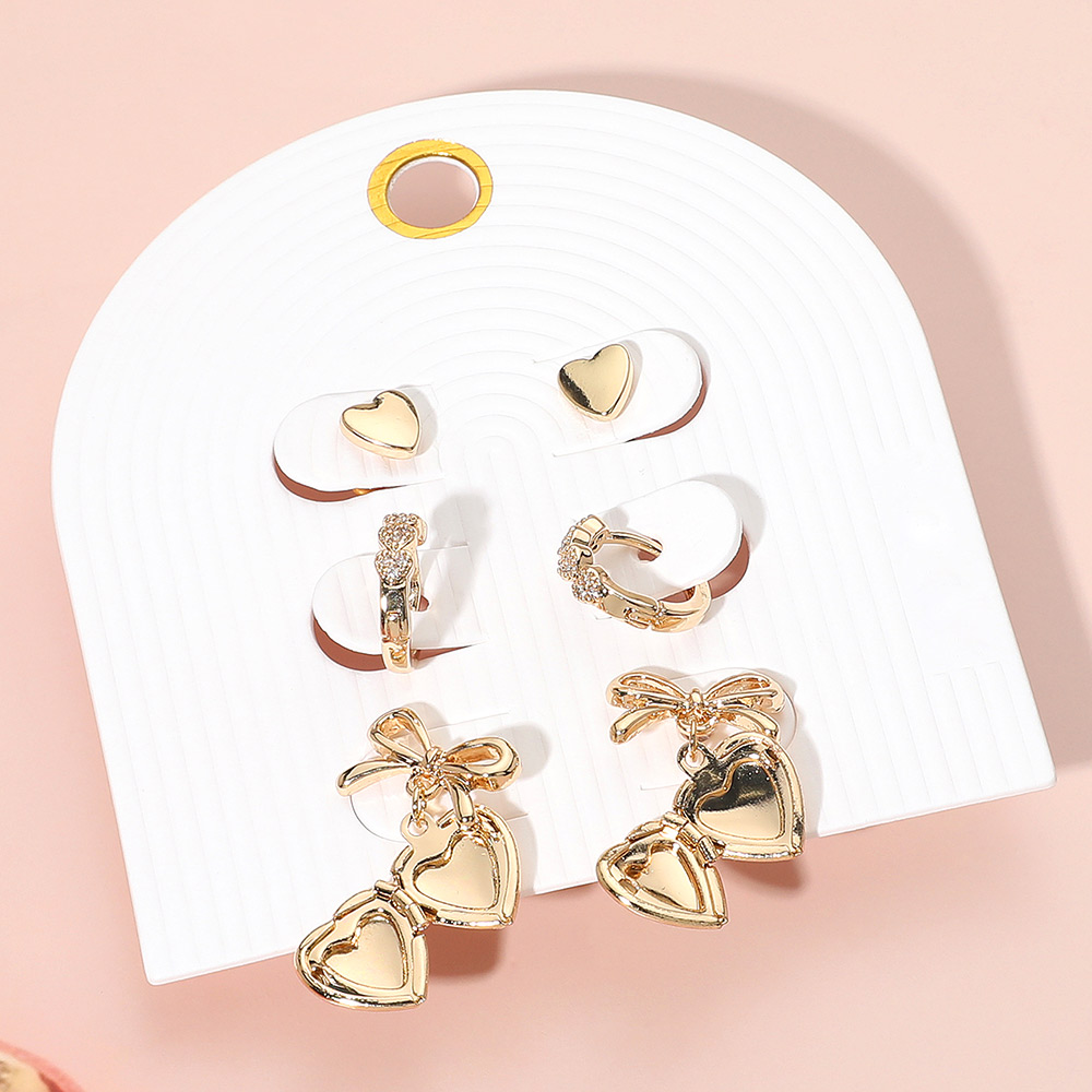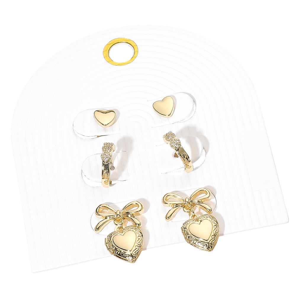 Details • Size : 0.5" - 0.8" L • Post Back, Huggie Back • Chic 3-pair earring set including heart studs, rhinestone-accented hoops, and dangling double-heart charms with bow details. Versatile mix of classic and statement styles. • Lead and Nickel Compliant