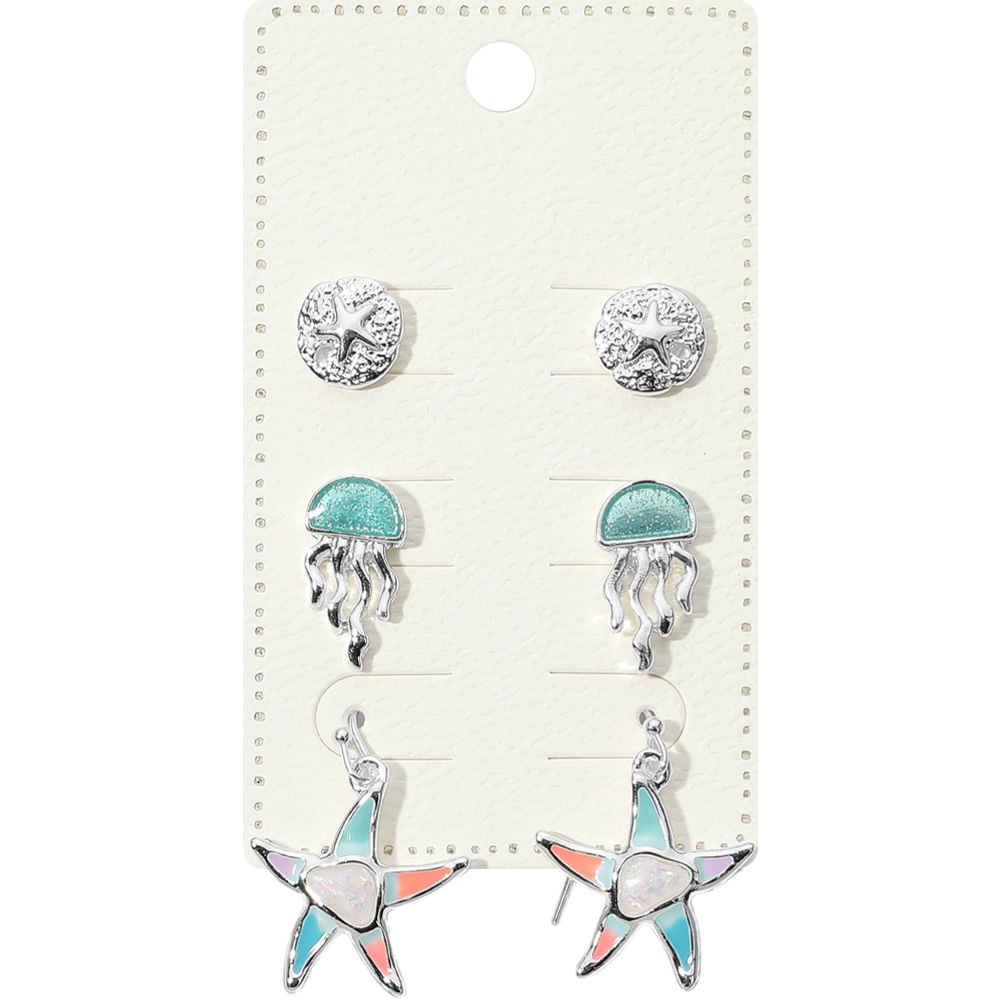 3Pairs - Metal Sand Dollar Enamel Jelly Fish Stud Starfish Dangle Earrings Set