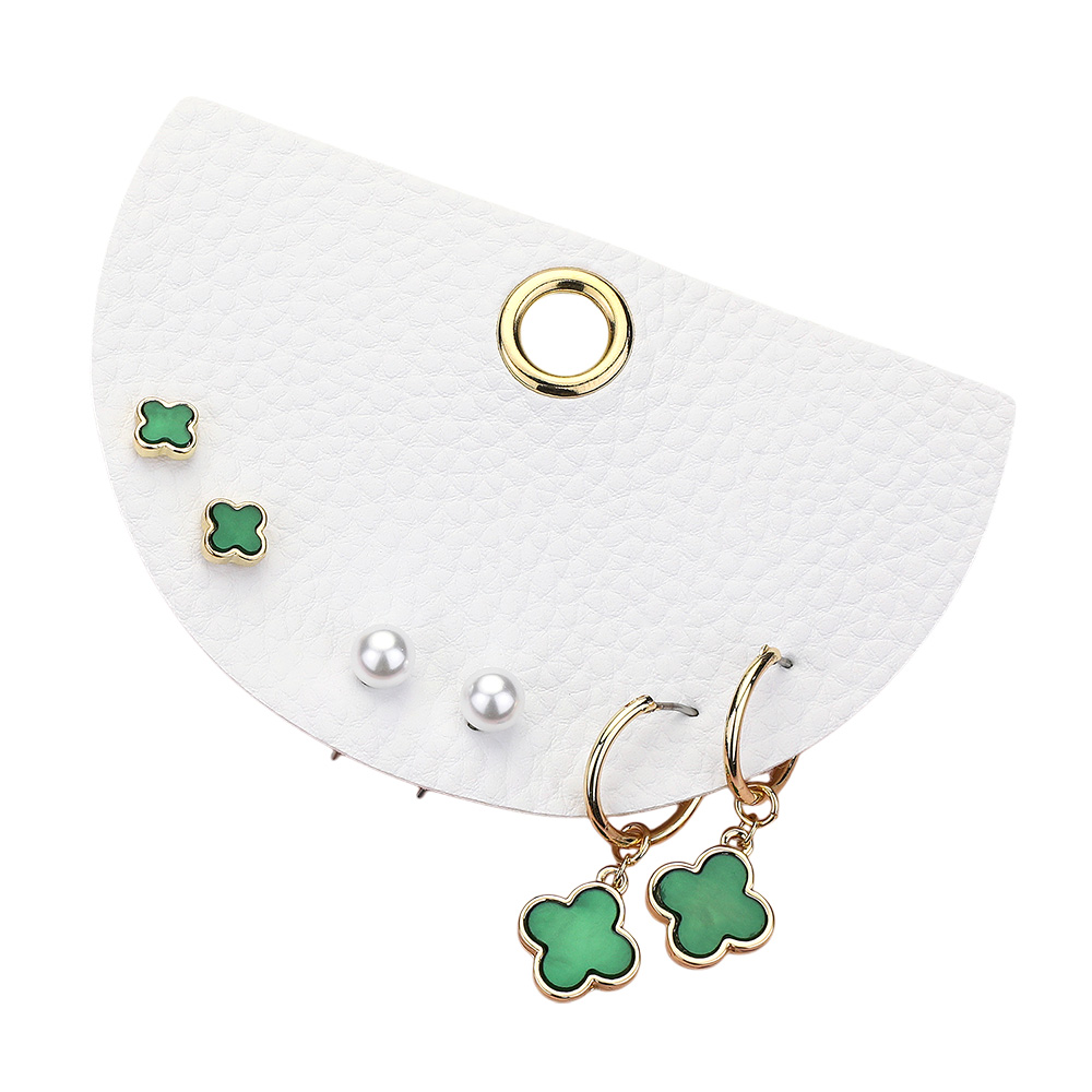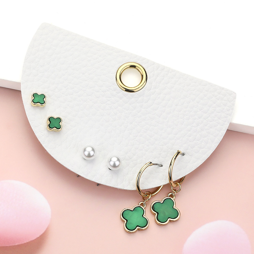 3Pairs - Quatrefoil Pearl Stud Quatrefoil Dangle Earring Set