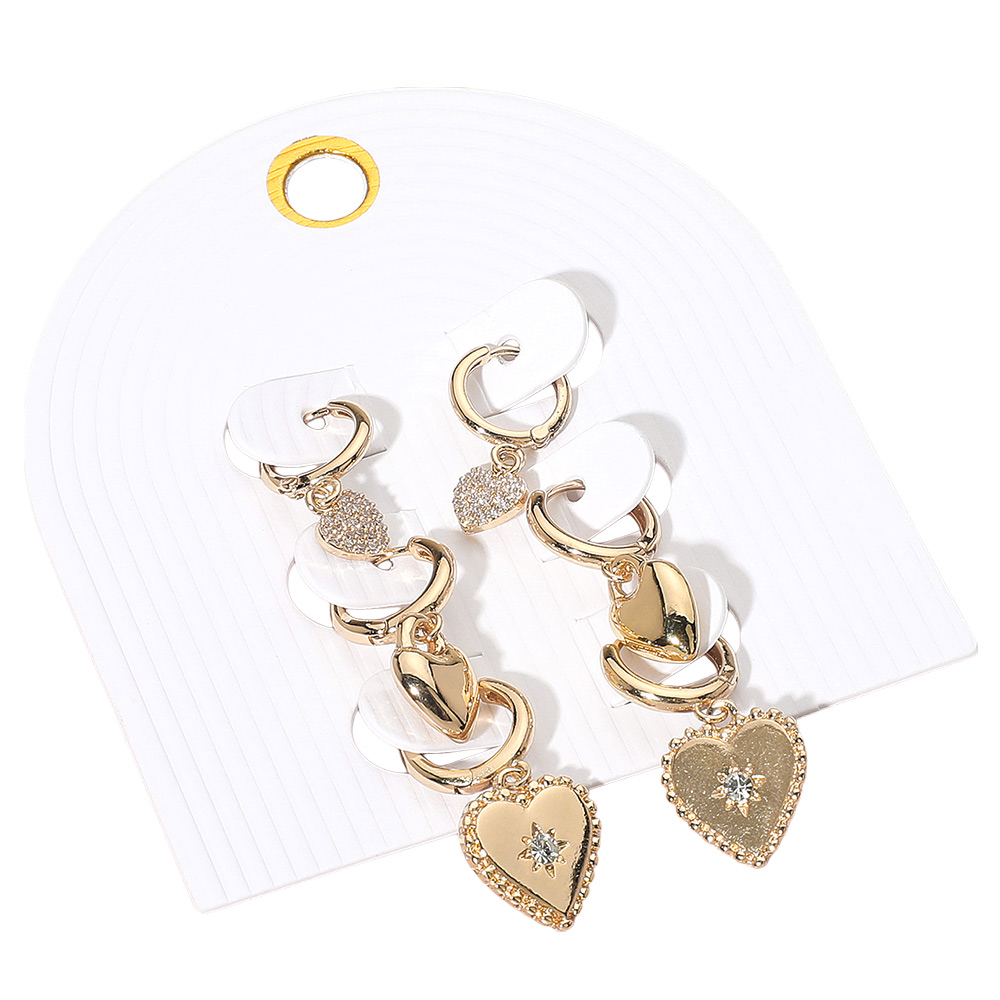 Details • Size : 0.75" L - 1.1" L • Huggie Back • Elegant earrings featuring tiered hoops, textured heart charms, and a sparkling heart pendant. A bold statement design blending sophistication and charm for stylish occasions. • Lead and Nickel Compliant