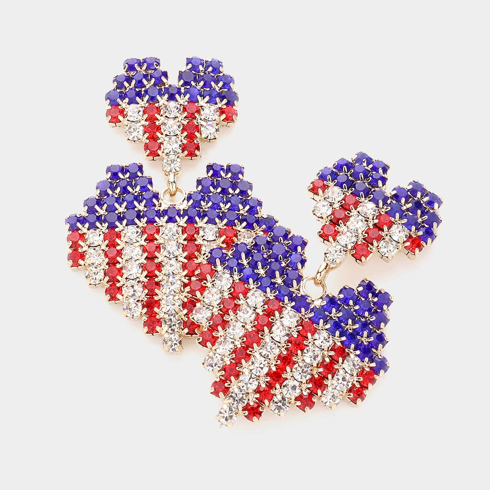 American USA Flag Rhinestone Paved Heart Dangle Earrings