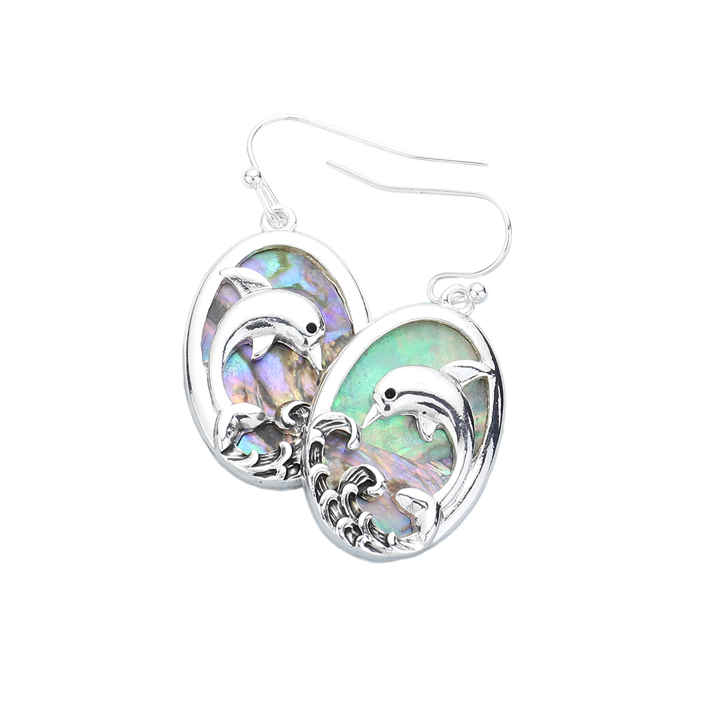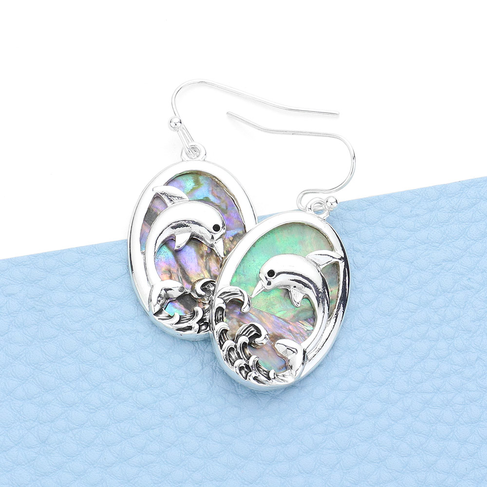 Antique Metal Abalone Dolphin Oval Dangle Earrings