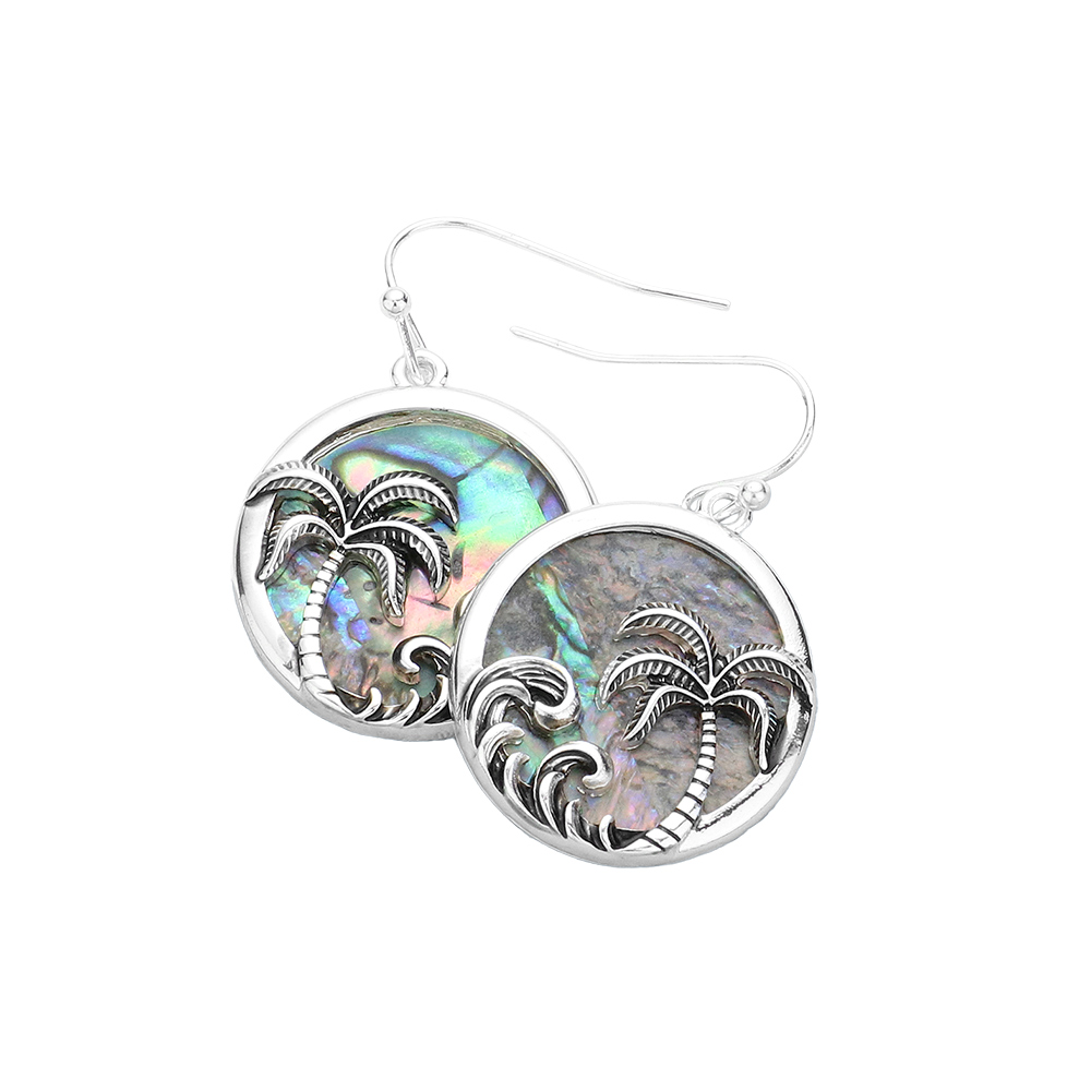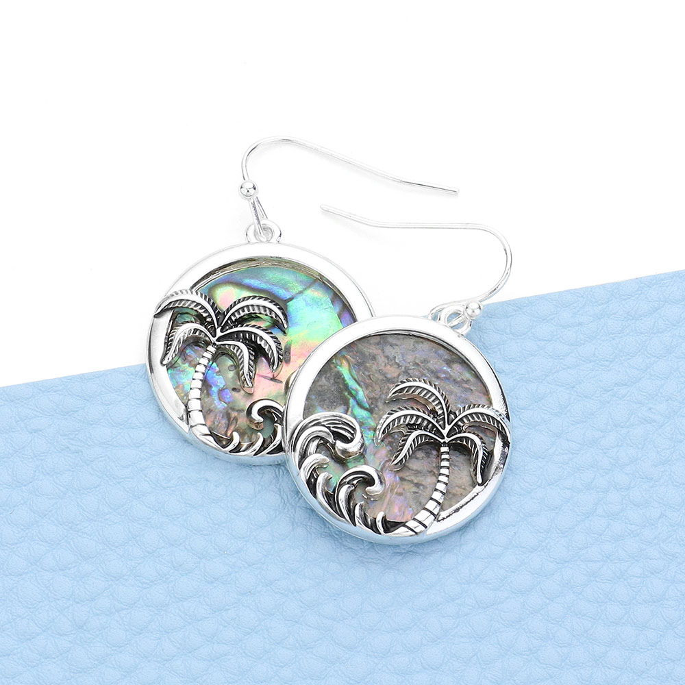 Antique Metal Abalone Palm Tree Circle Dangle Earrings