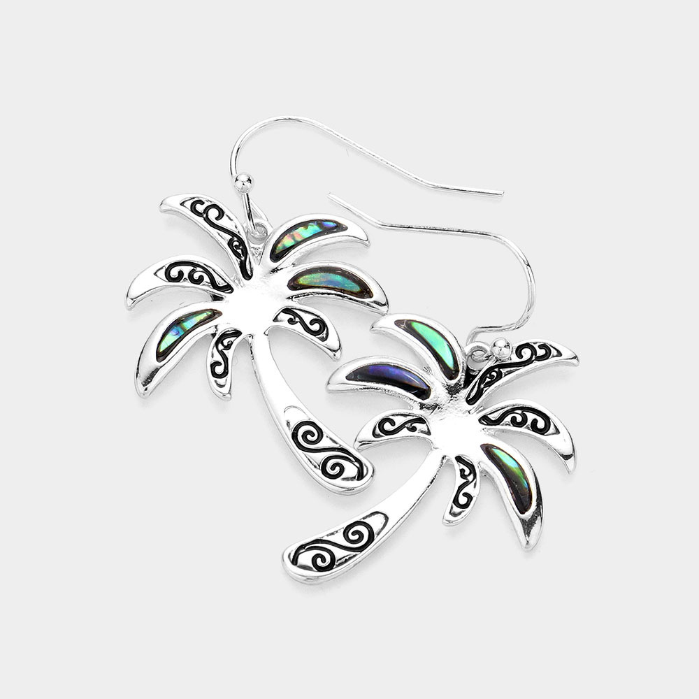 Antique Metal Abalone Palm Tree Dangle Earrings