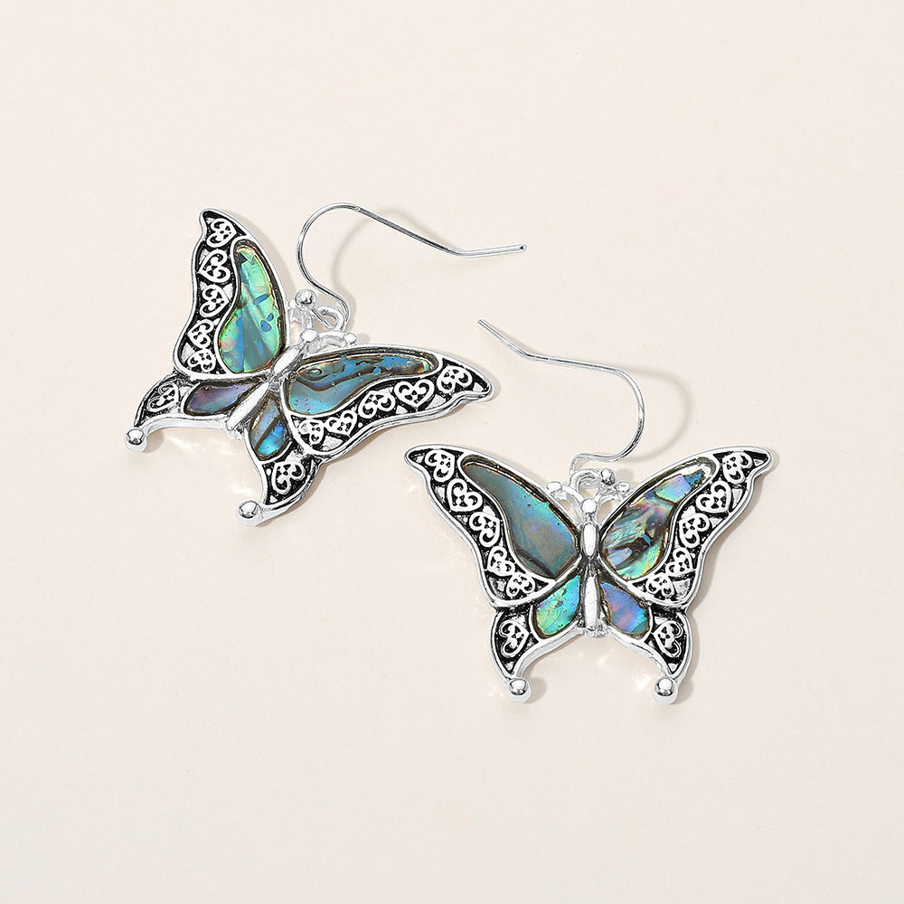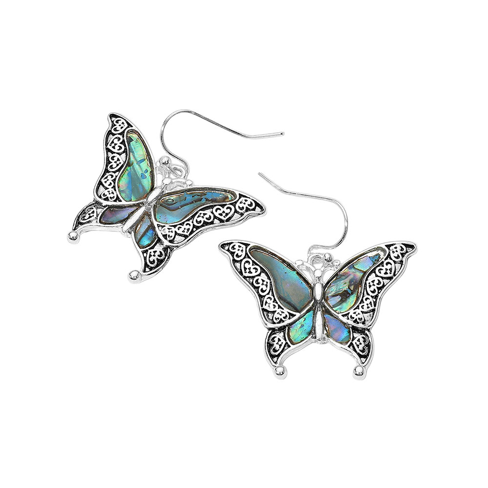 Antique Metal Abalone Pointed Butterfly Dangle Earrings