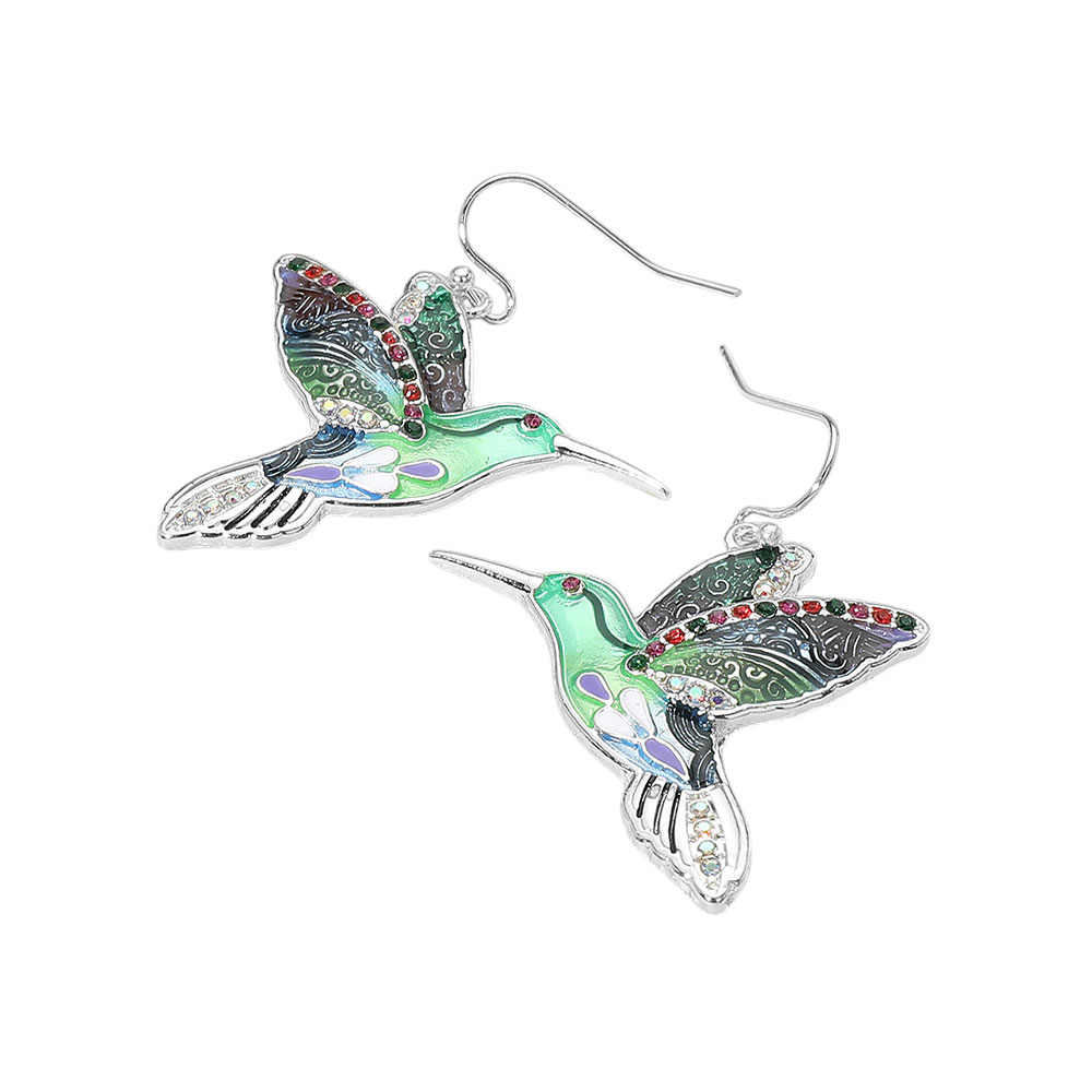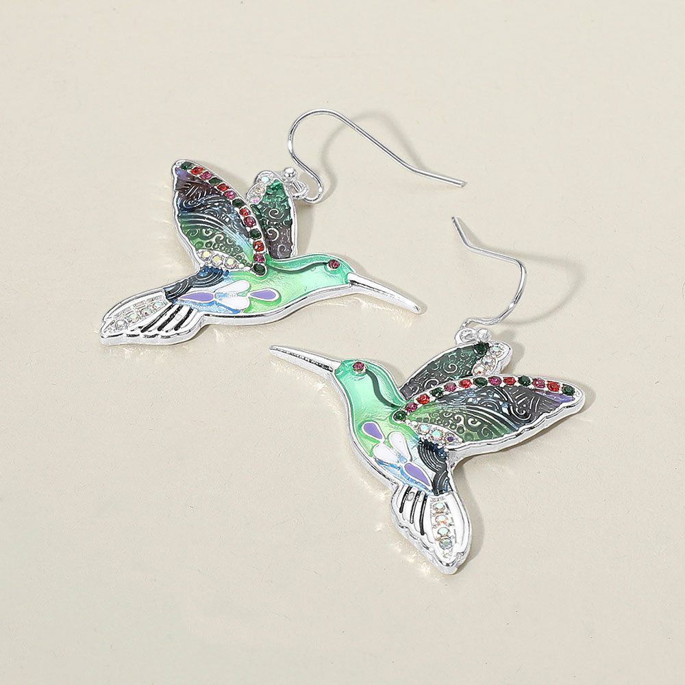 Antique Metal Stone Paved Enamel Bird Dangle Earrings