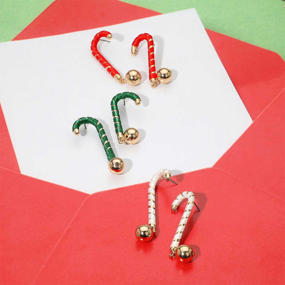 Details • Size : 0.7" X 2" • Post Back • Celebrate the season with these festive candy cane earrings, featuring a whimsical curved design and shiny round accents that add a touch of holiday magic to any outfit. Perfect for parties, events, or seasonal gifting. • Lead and Nickel Compliant