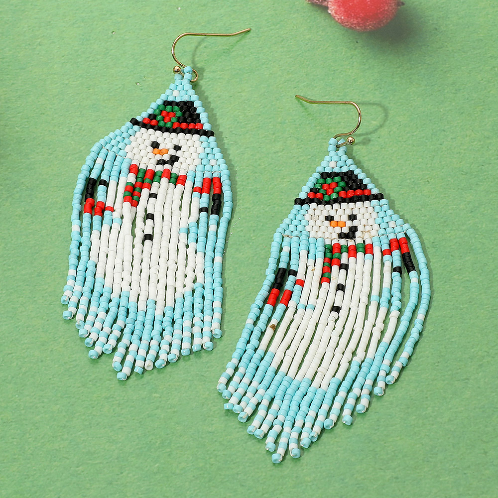 • Festive beaded earrings featuring cheerful snowmen with dangling fringe. A fun and playful holiday accessory perfect for seasonal outfits and winter celebrations.