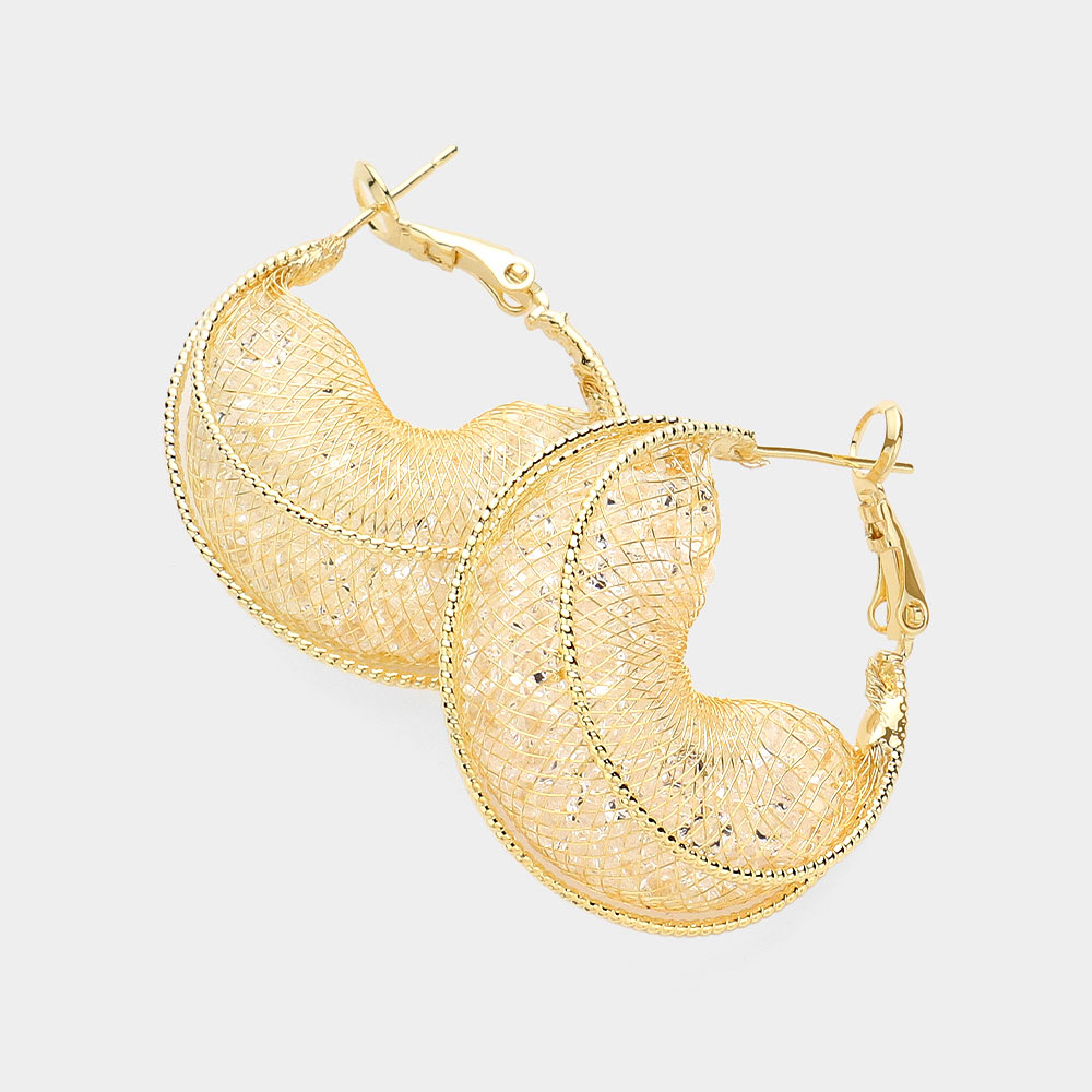 Beads Inside Metal Mesh Crescent Hoop Earrings