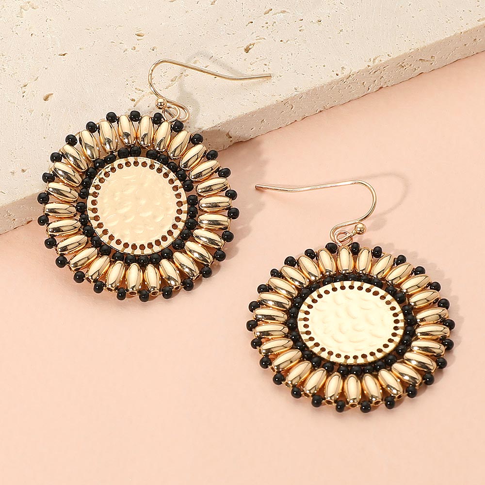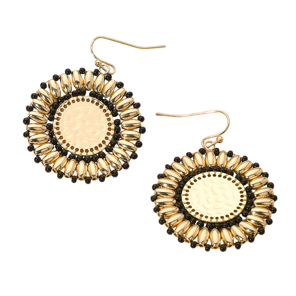 Details • Size : 1.25" X 1.75" • Fish Hook Back • Handcrafted round earrings with intricate bead detailing and tribal-inspired patterns. Lightweight and bold, these earrings add a bohemian edge to casual or dressy outfits with their striking circular design. • Lead and Nickel Compliant