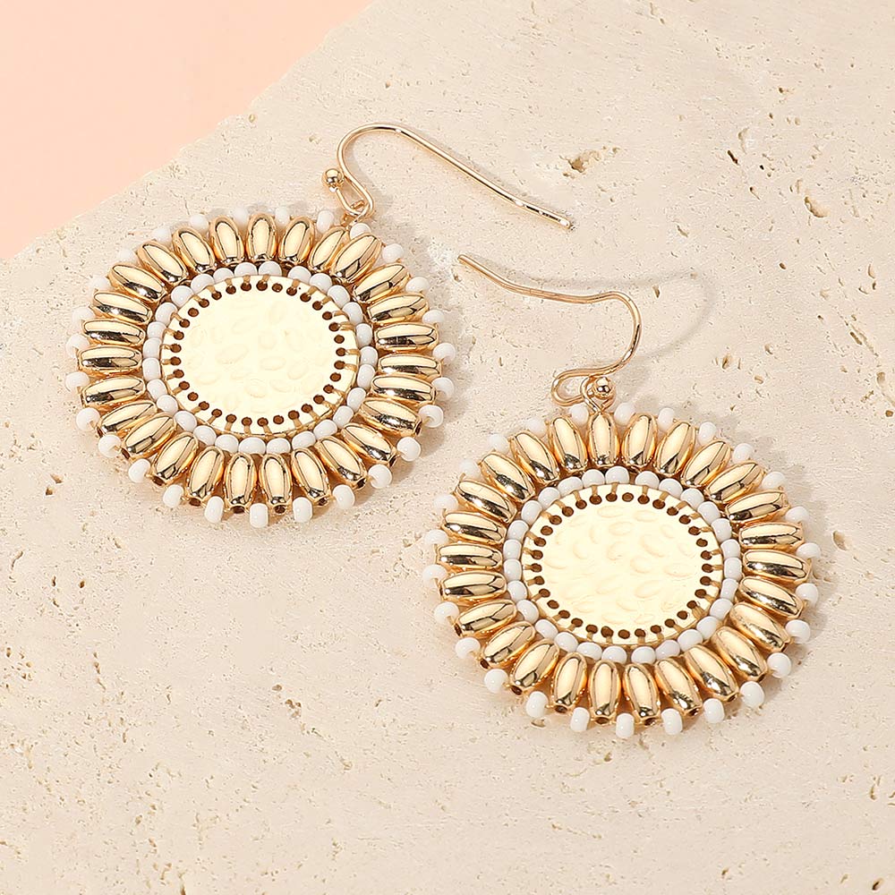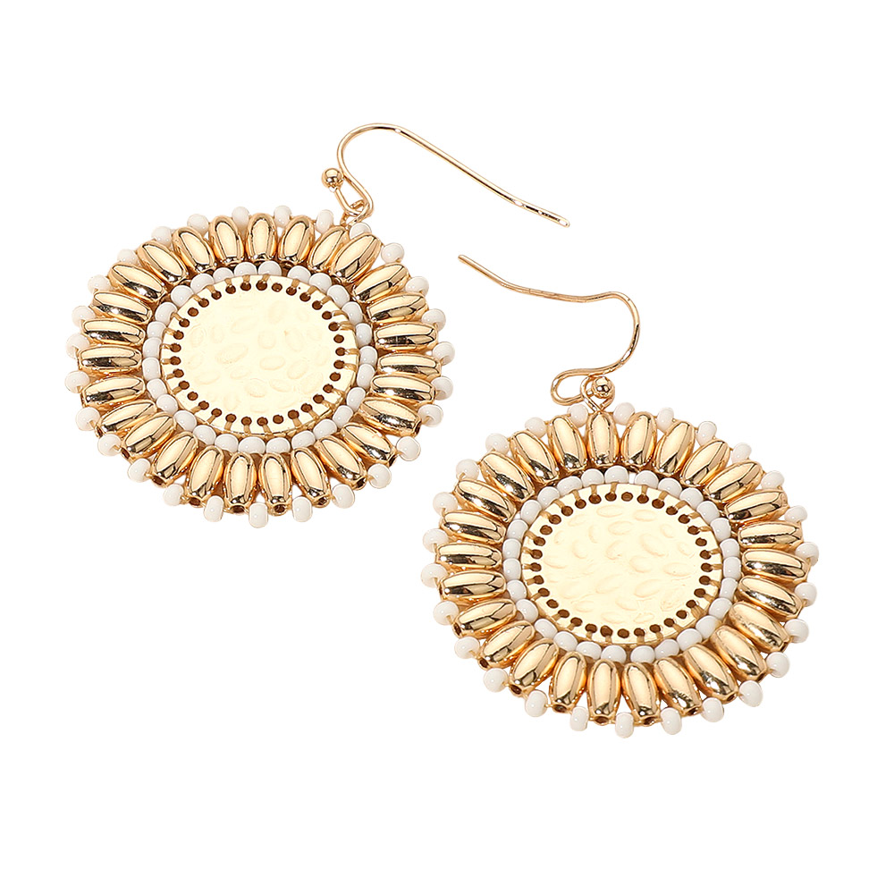 Details • Size : 1.25" X 1.75" • Fish Hook Back • Handcrafted round earrings with intricate bead detailing and tribal-inspired patterns. Lightweight and bold, these earrings add a bohemian edge to casual or dressy outfits with their striking circular design. • Lead and Nickel Compliant