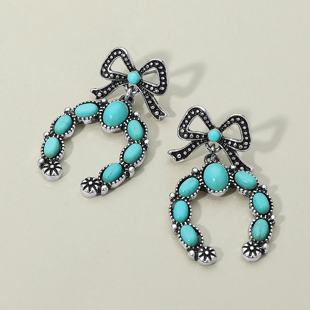 Details • Size : 1" X 1.75" • Post Back • Unique drop earrings featuring a bow accent paired with horseshoe-shaped pendants decorated with oval beads and intricate vintage-inspired detailing. A charming statement accessory for bold and playful style. • Lead and Nickel Compliant