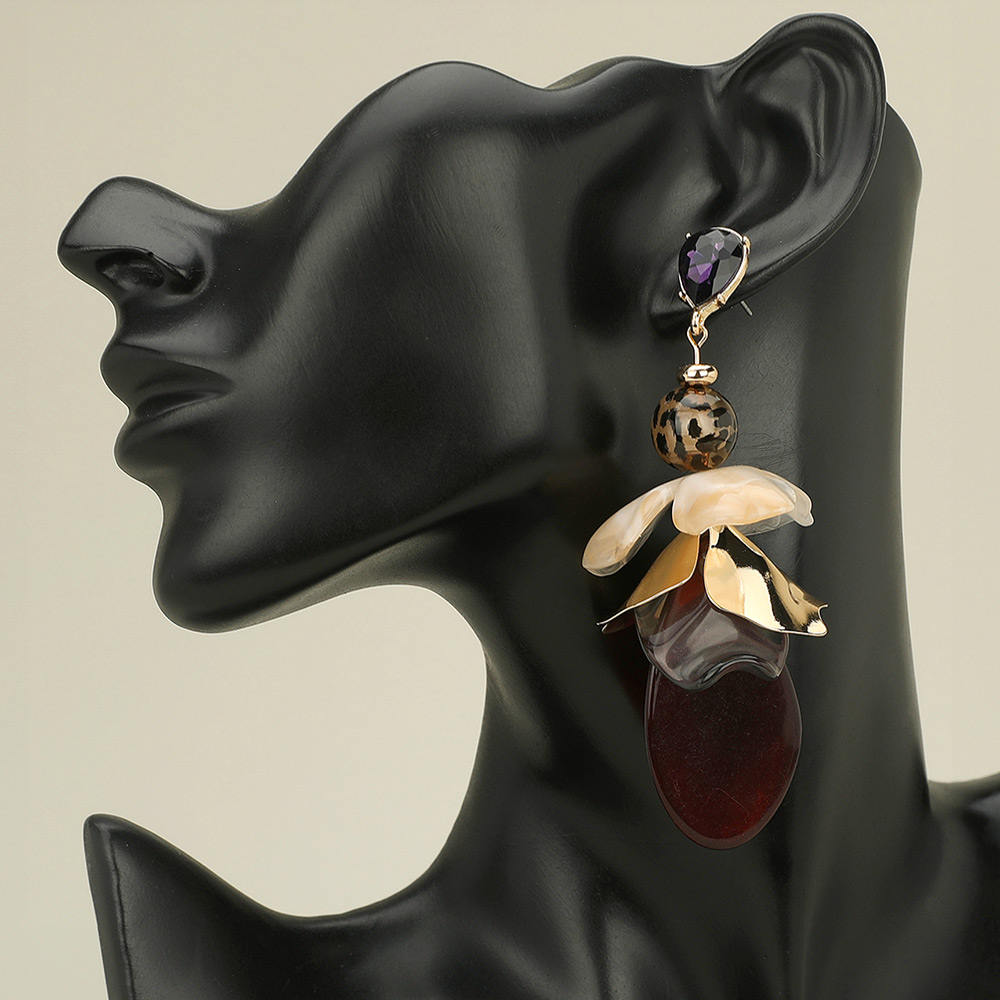 • These floral statement drop earrings feature layered petal-inspired details with a bold mix of textures and tones. Finished with a sparkling stud accent, they create a dramatic yet elegant look—perfect for adding a standout touch to evening outfits or special occasions.