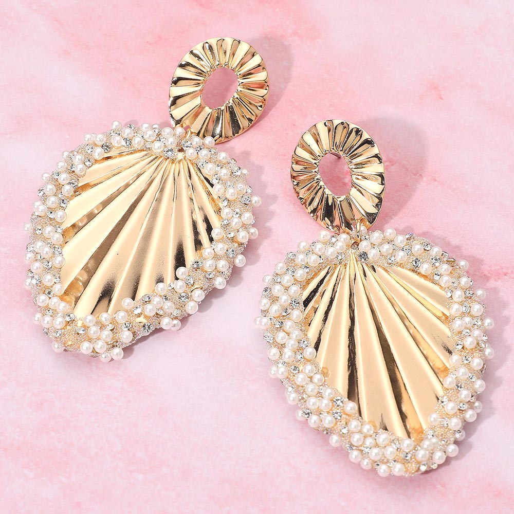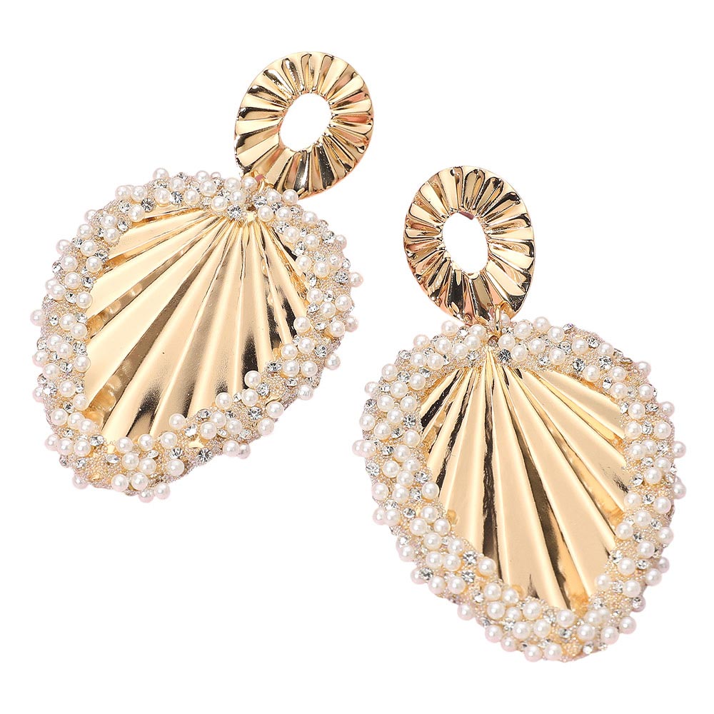 Details • Size : 1.75" X 3.25" • Post Back • These pearl-edged sculptural drop earrings showcase a radiant, pleated design framed with delicate beading for a luxurious finish. Their bold yet refined shape exudes elegance, making them an ideal accessory for evening events, celebrations, or to elevate a sophisticated daytime look. • Lead and Nickel Compliant