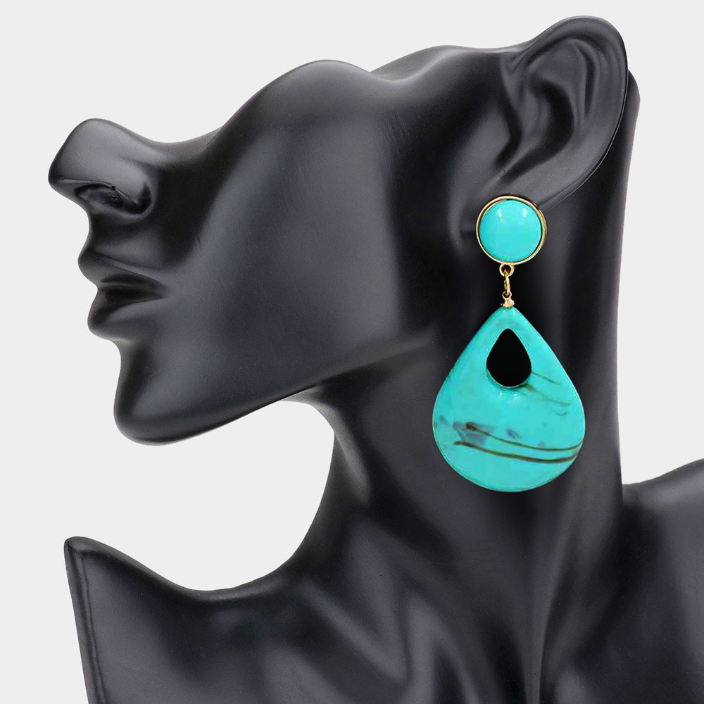 Details • Size : 1.6" X 3.25" • Post Back • Stylish dangle earrings featuring a round stud with a teardrop-shaped cutout drop. A modern accessory that combines bold and elegant design, perfect for adding a statement touch to casual looks or enhancing evening outfits with chic sophistication. • Lead and Nickel Compliant