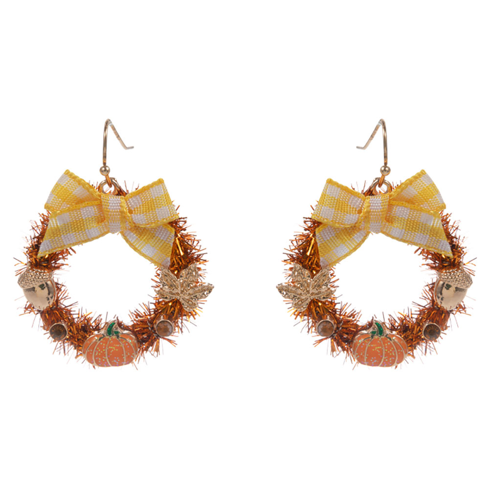 Details • Size : 1.25" X 1.5" • Brass Fish Hook Back • Autumn wreath dangle earrings featuring bow, pumpkin, leaf, and acorn embellishments. A festive accessory to complete your fall fashion or Thanksgiving celebration look. • Hypoallergenic • Lead and Nickel Compliant