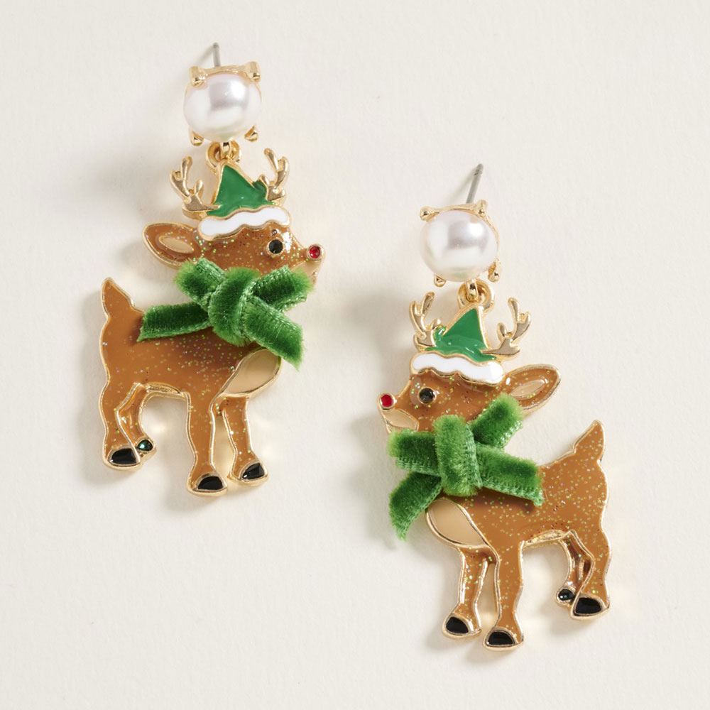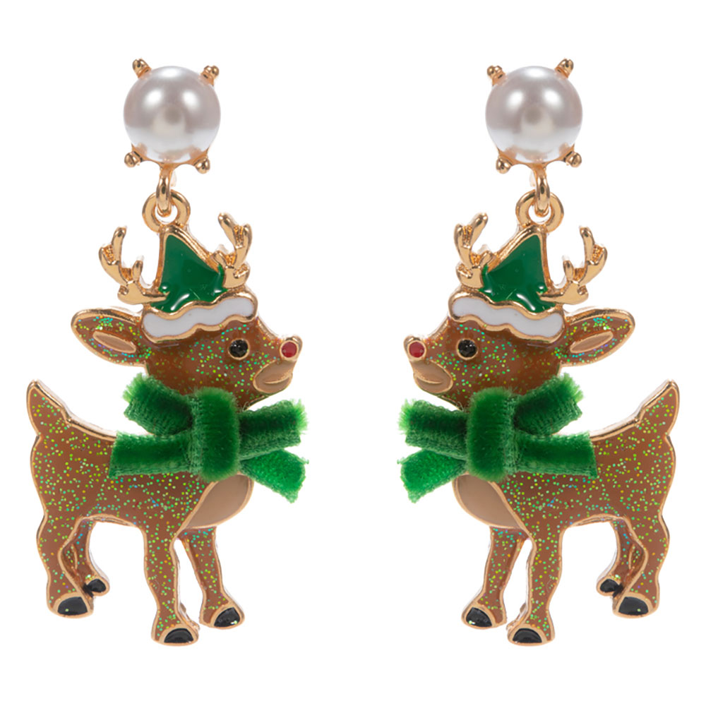 Details • Size : 1" X 1.8" • Titanium Post Back • Celebrate the season in style with these charming reindeer earrings, featuring glittering accents, festive green bows, and holiday hats. A playful and spirited accessory for Christmas parties and winter cheer. • Lead and Nickel Compliant • Hypoallergenic