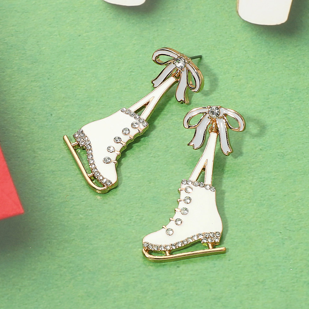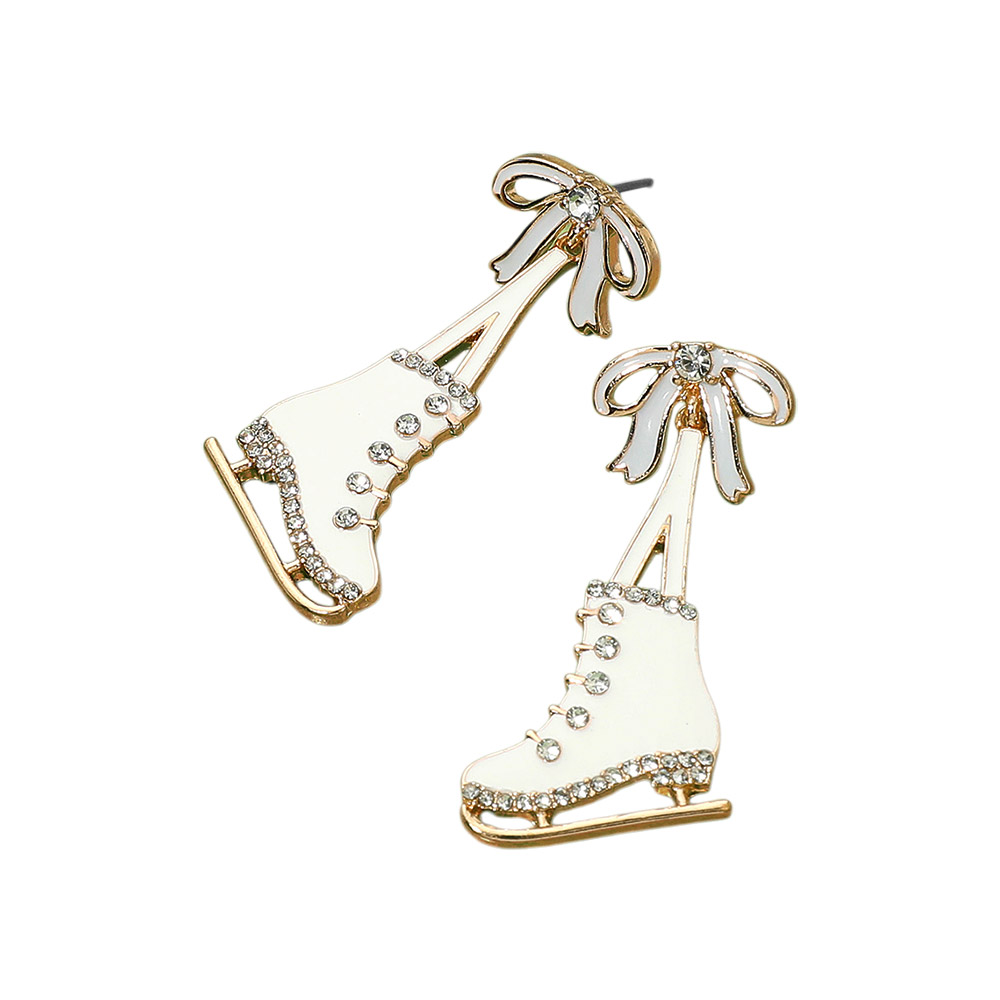 Details • Size : 0.75" X 1.75" • Post Back • Add a playful winter charm to your look with these ice skate dangle earrings. Adorned with sparkling crystal details and bow accents, they bring a festive and stylish touch, perfect for holiday parties, seasonal outfits, or gifting. • Lead and Nickel Compliant