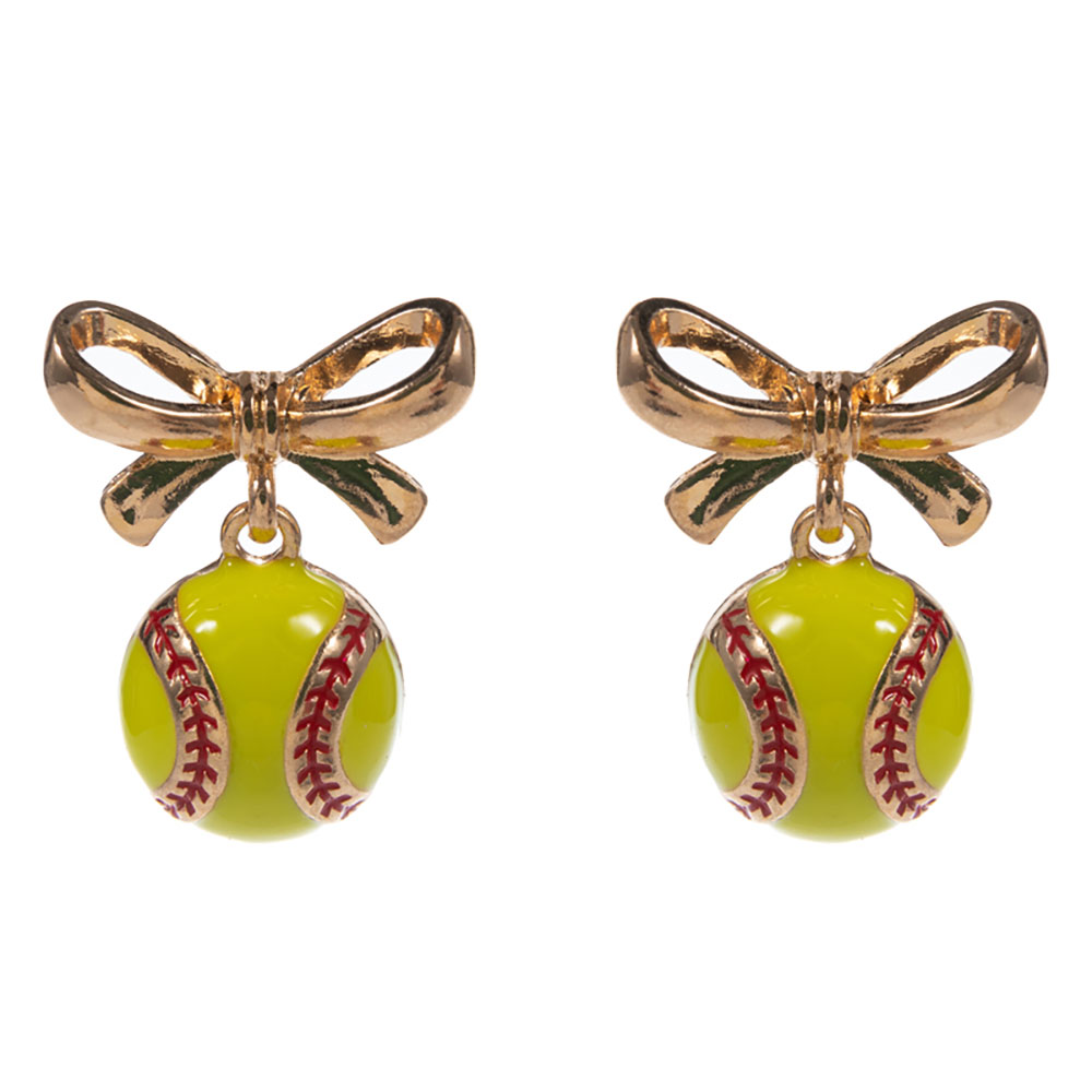 Details • Size : 0.8" X 1.1" • Titanium Post Back • Add playful charm to your game-day outfit with these glitter softball drop earrings. Featuring a cute bow detail, they’re perfect for tailgates, sports events, or showing team spirit in a fun and stylish way. • Lead and Nickel Compliant • Hypoallergenic