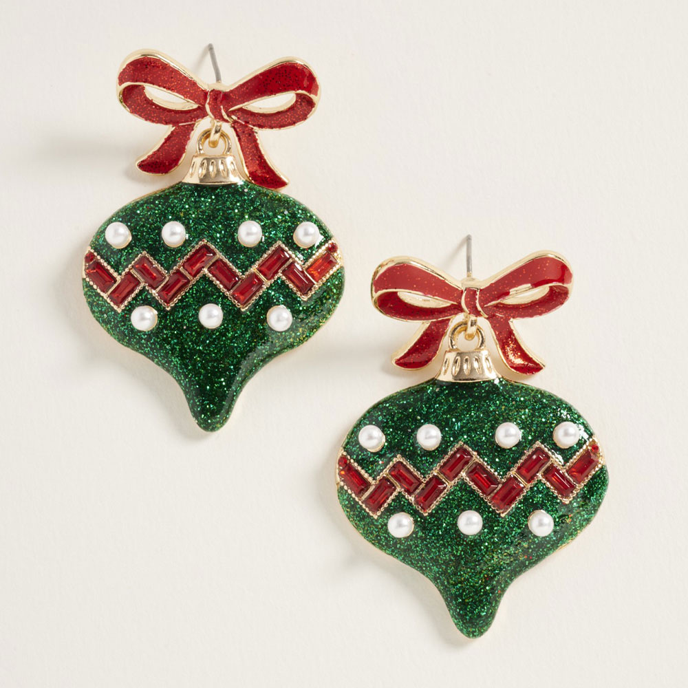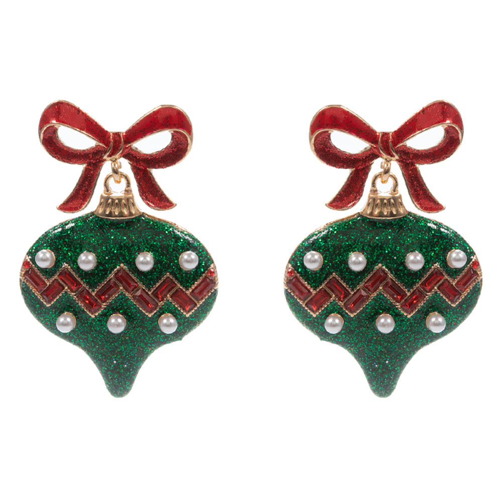 • Celebrate the season with these holiday ornament earrings featuring a charming bow design and sparkling accents. A perfect accessory to elevate festive outfits and holiday party looks.