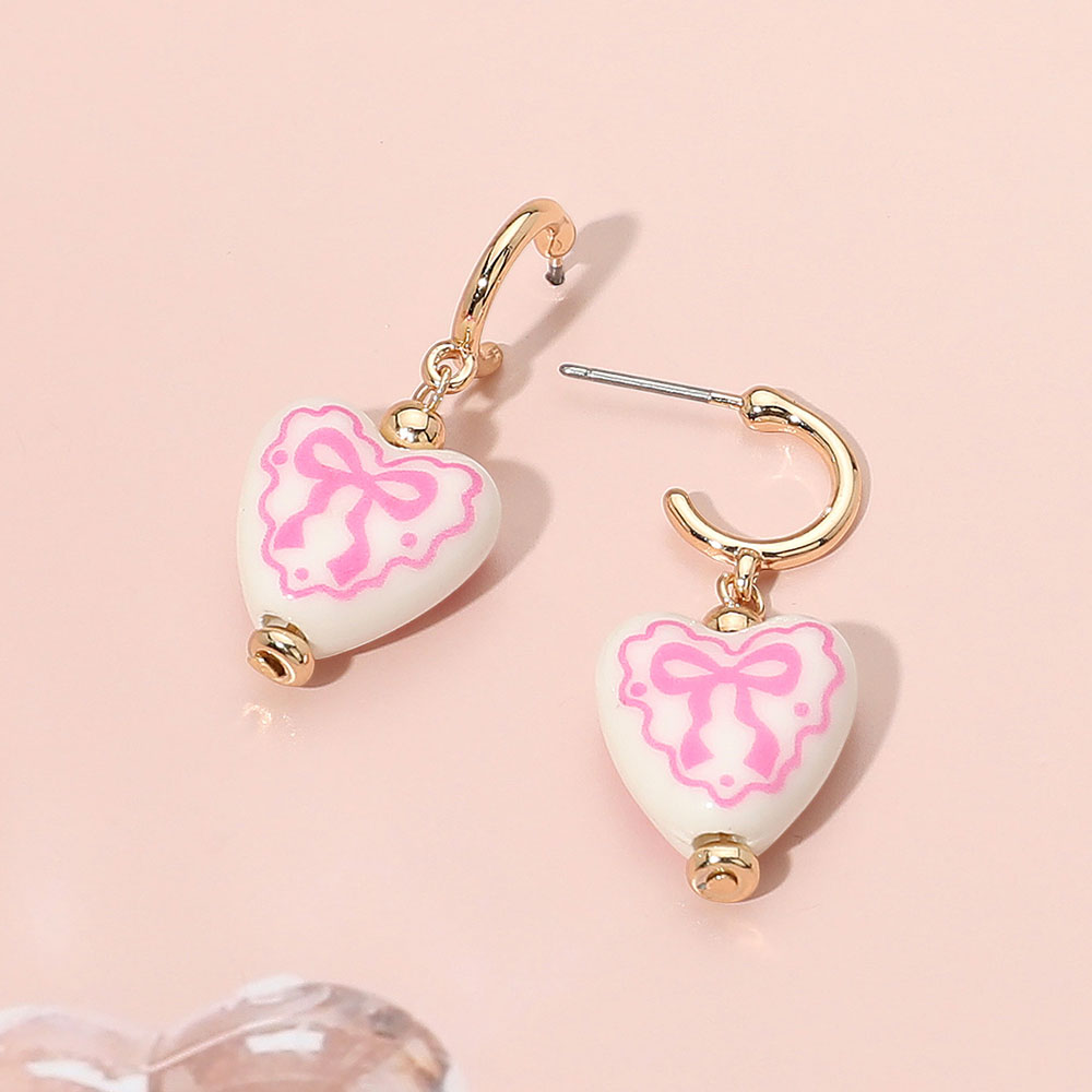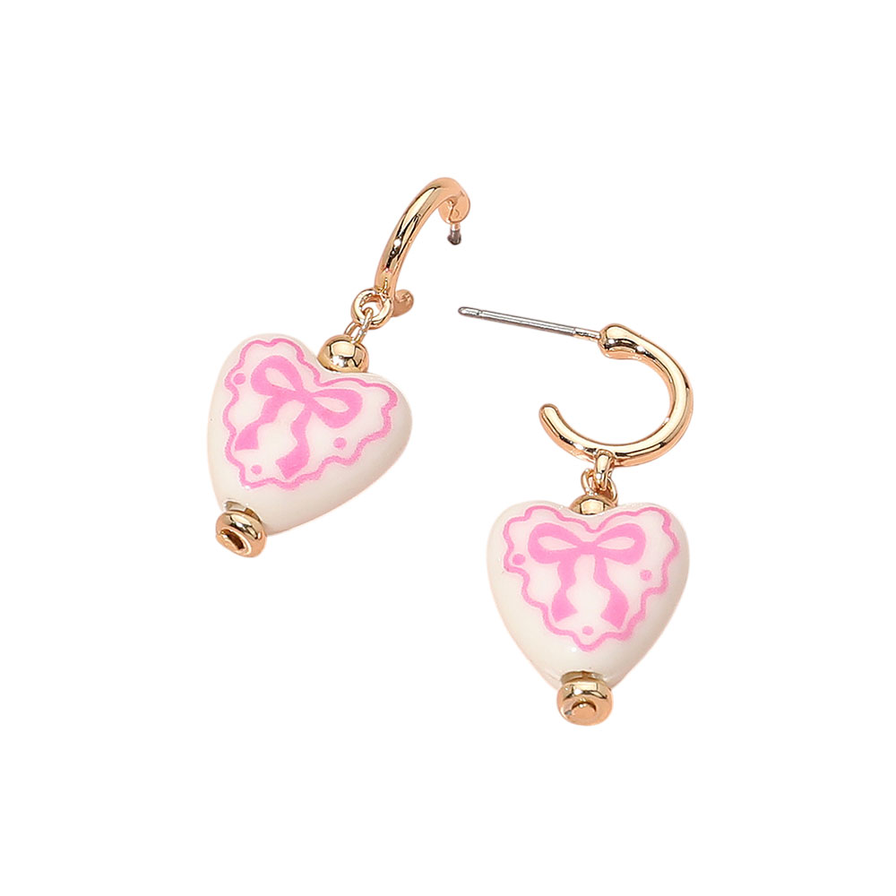 Details • Size : 0.6" X 1.3" • Post Back • Charming drop earrings featuring heart-shaped porcelain-style charms adorned with a delicate bow design. A sweet and elegant accessory perfect for casual or romantic looks. • Lead and Nickel Compliant