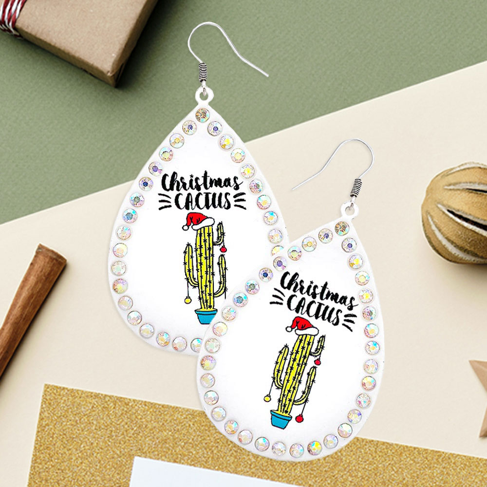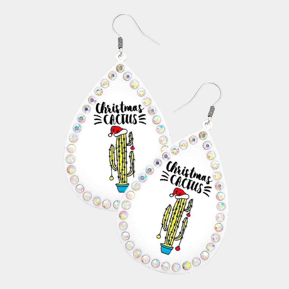 Christmas Cactus Message Stone Trimmed Metal Teardrop Dangle Earrings