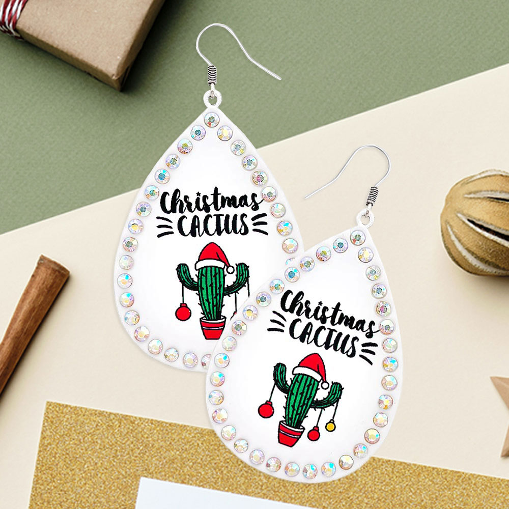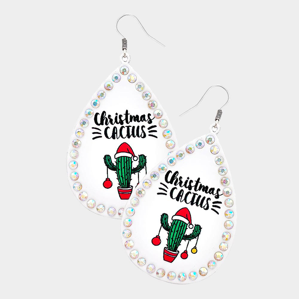 Christmas Cactus Message Stone Trimmed Metal Teardrop Dangle Earrings