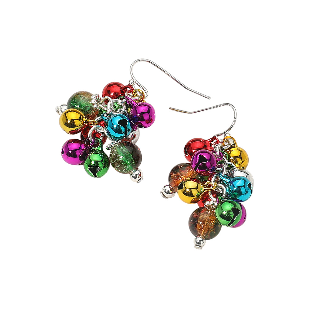 Details • Size : 0.8" X 1.6" • Fish Hook Back • Add a playful and festive touch to your look with these delightful Charm Cluster Dangle Earrings. Each piece features a vibrant cluster of tiny, multi-shade jingle bells mixed with unique crackle-glass beads. The shiny, metallic bells and iridescent glass create a sparkling, eye-catching effect. These earrings offer a fun, youthful statement perfect for holidays, parties, or adding a joyful pop to any casual outfit. They are lightweight and hang from secure sterling silver-plated fish hooks. • Lead and Nickel Compliant