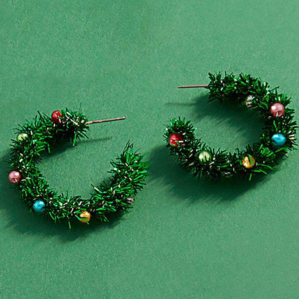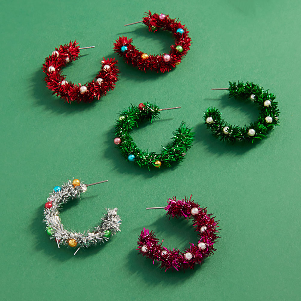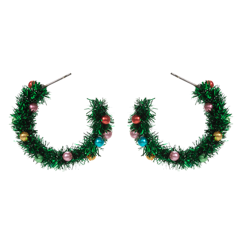 Details • Size : 1.25" X 1.25" • Titanium Post Back • Celebrate the season with these festive tinsel hoop earrings, decorated with miniature ornament accents for a cheerful holiday touch. Lightweight and eye-catching, they’re perfect for adding playful flair to party outfits, winter gatherings, or seasonal celebrations. • Lead and Nickel Compliant • Hypoallergenic