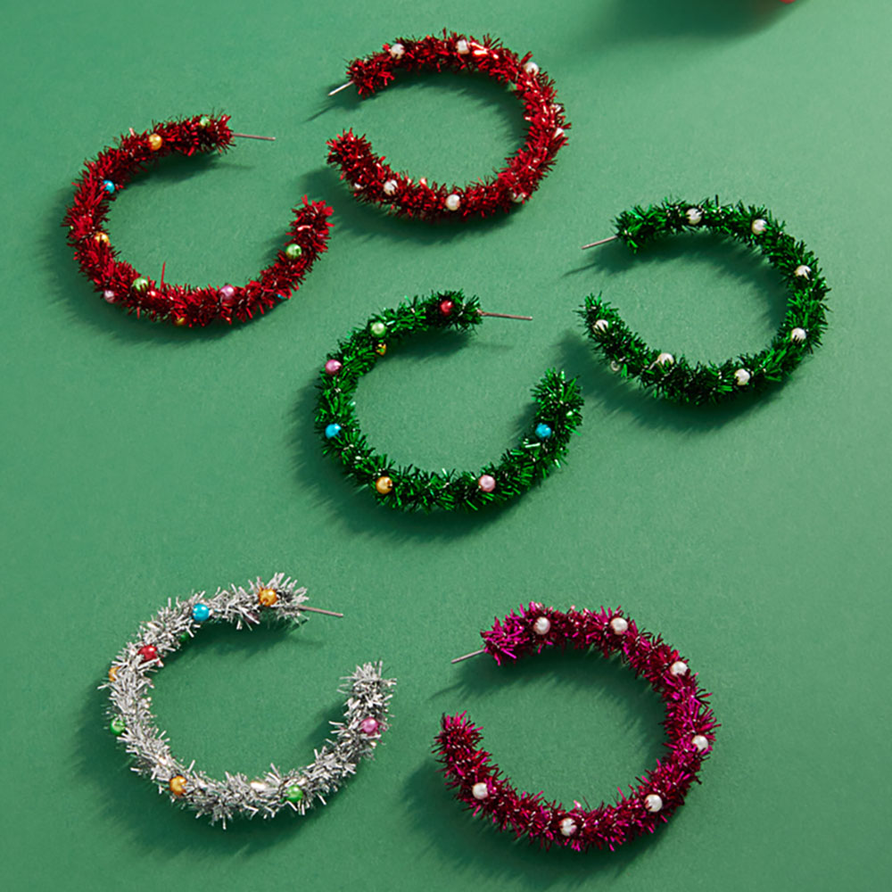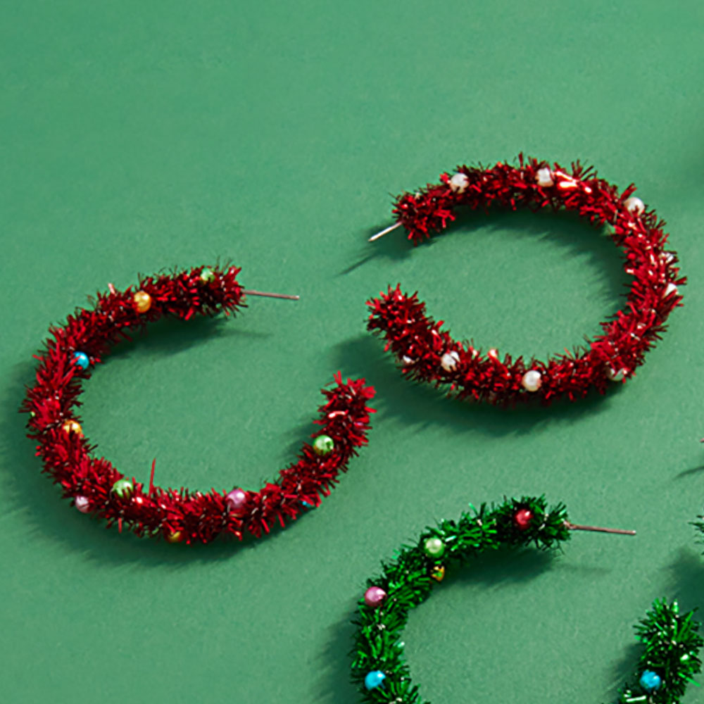 • Celebrate the season with these festive tinsel hoop earrings, decorated with miniature ornament accents for a cheerful holiday touch. Lightweight and eye-catching, they’re perfect for adding playful flair to party outfits, winter gatherings, or seasonal celebrations.