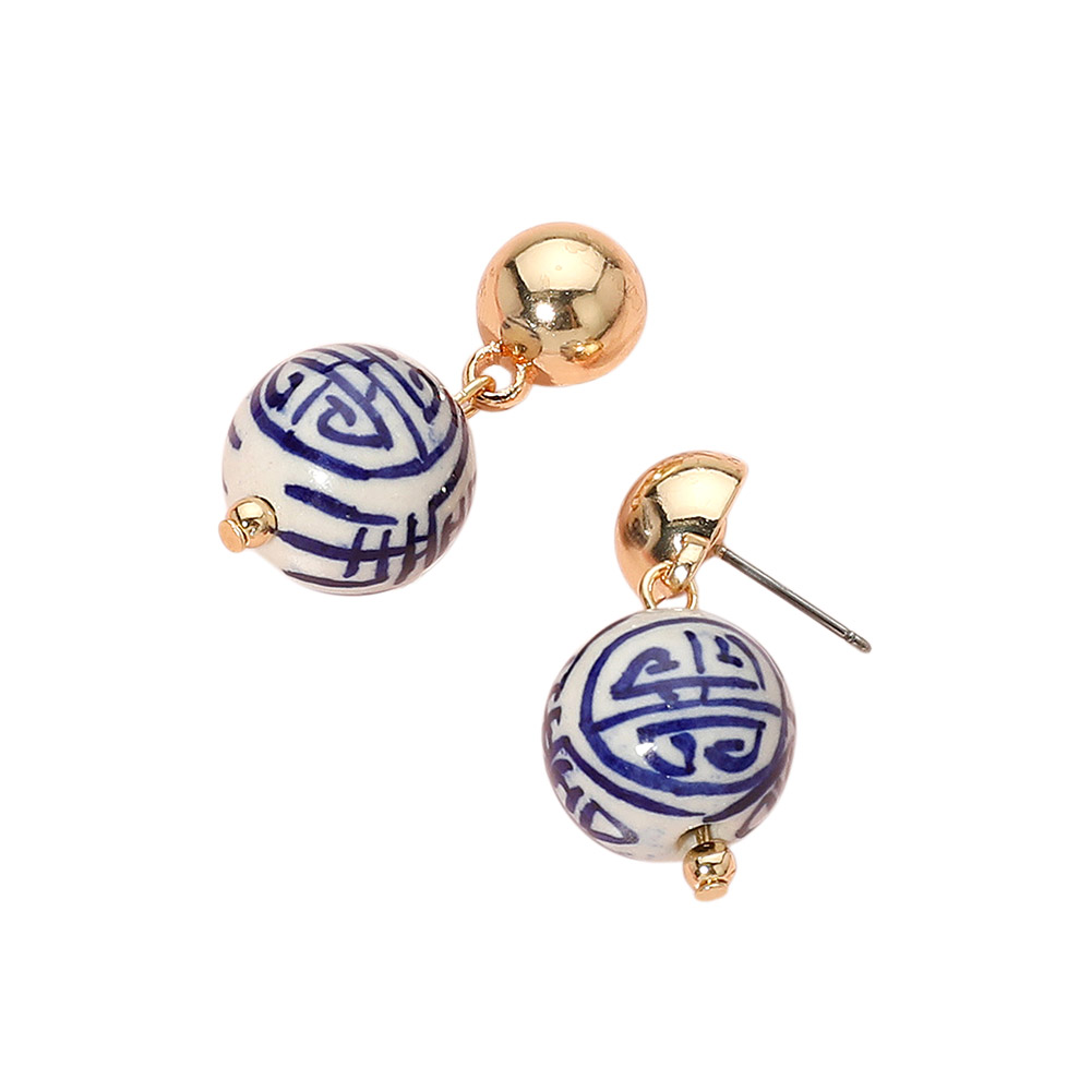 Details • Size : 0.6" X 1.25" • Post Back • Elegant drop earrings featuring spherical porcelain-style beads with a timeless motif. A graceful accessory that adds a touch of classic charm to any outfit or occasion. • Gold Dipped • Lead and Nickel Compliant